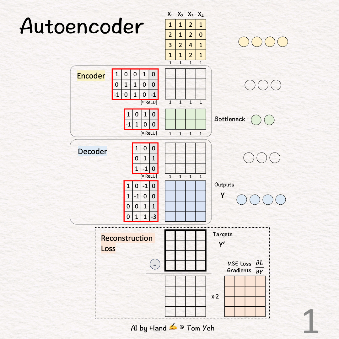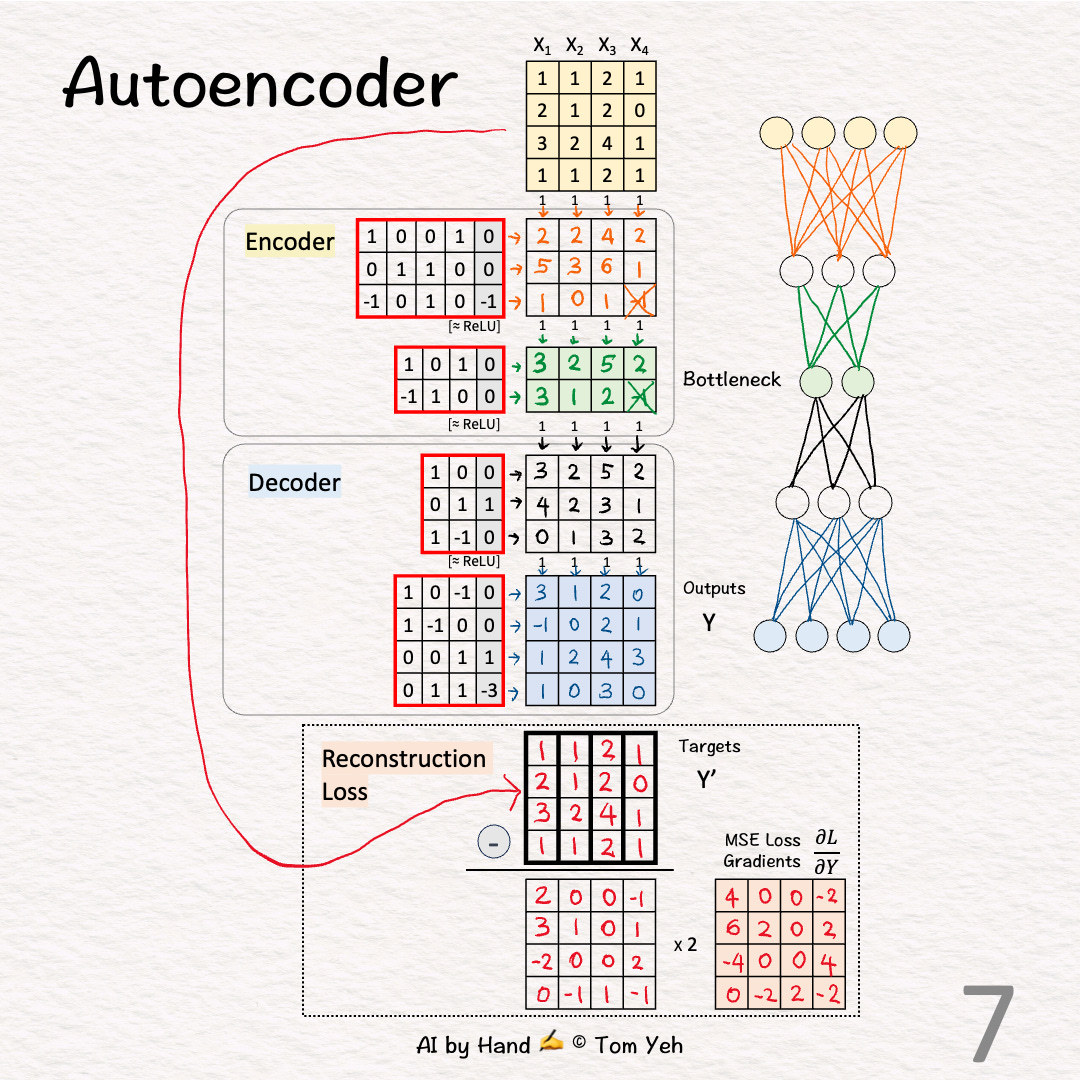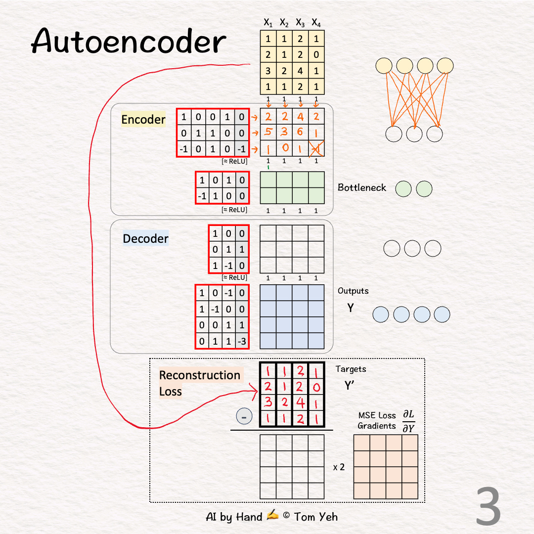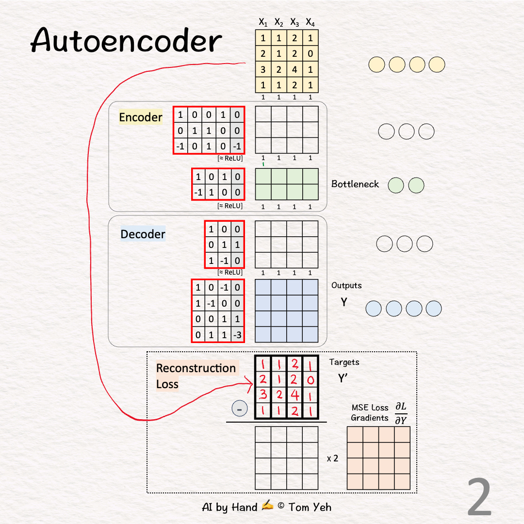 ↳ The Outputs (Y) are the Decoder's attempt to reconstruct the training examples from their reduced 2-D representation (green 🟩).