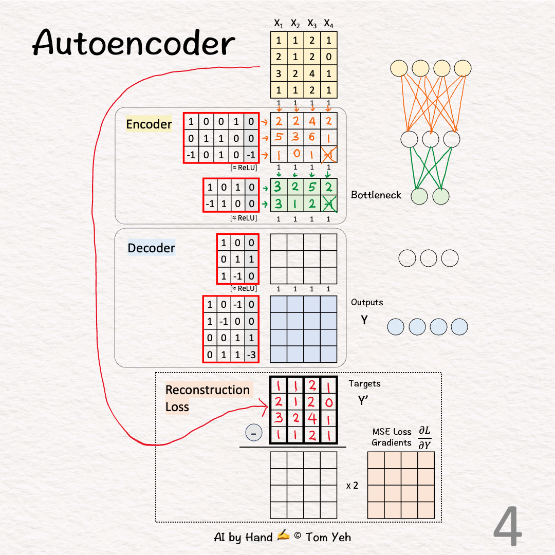 ↳ This layer is often called the "bottleneck" because its outputs (green 🟩) have a lot fewer feature dimensions (2) than the input features (4).