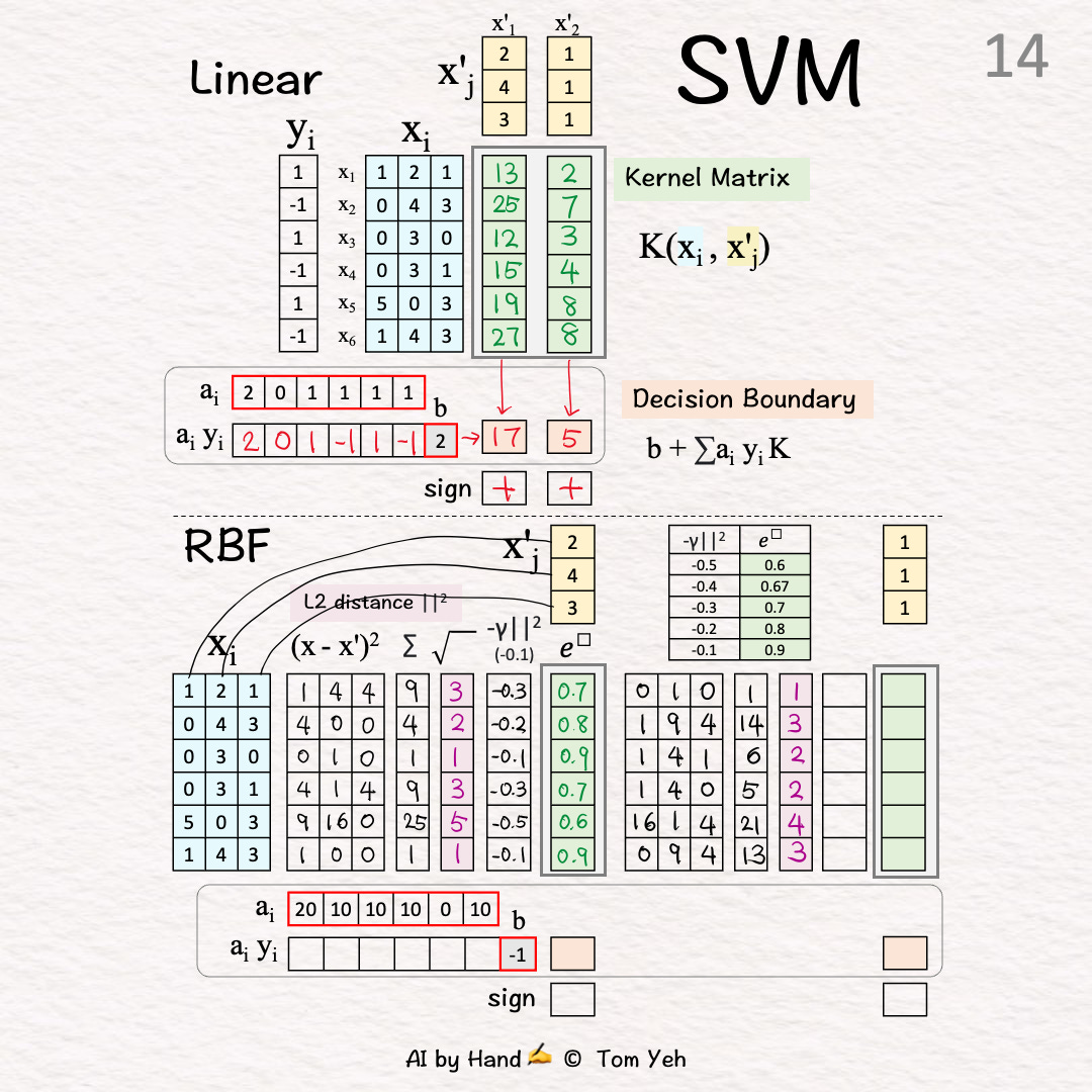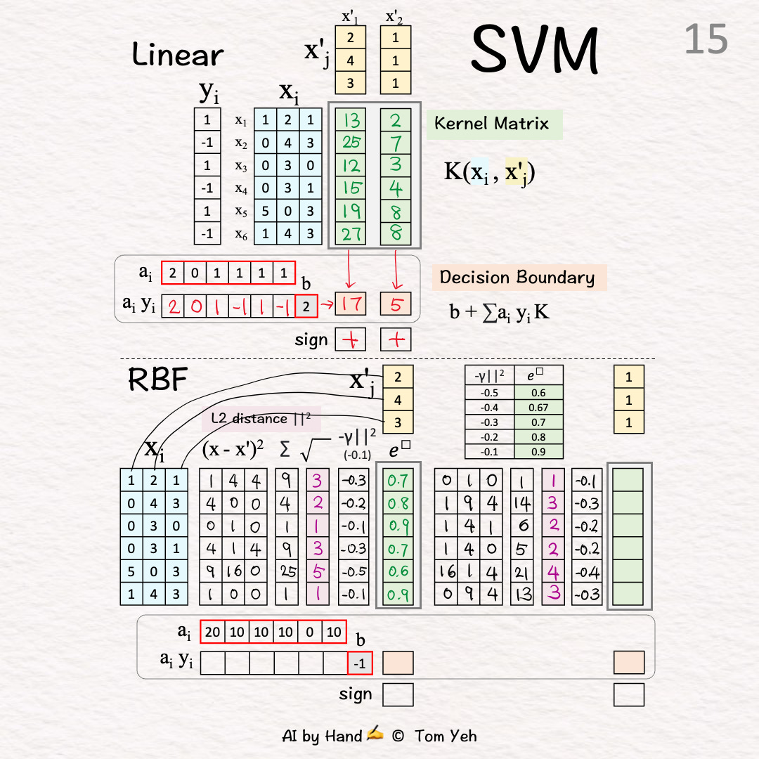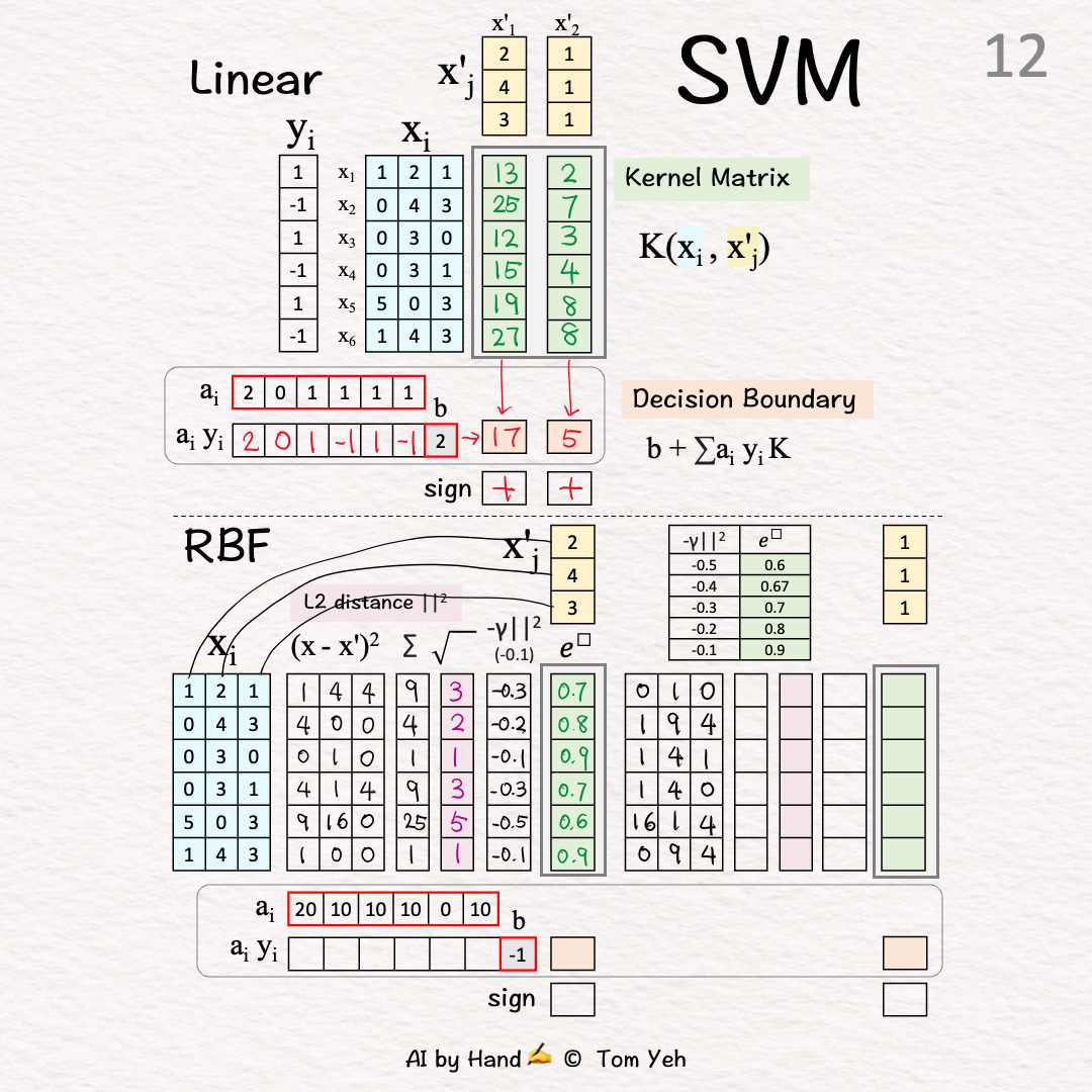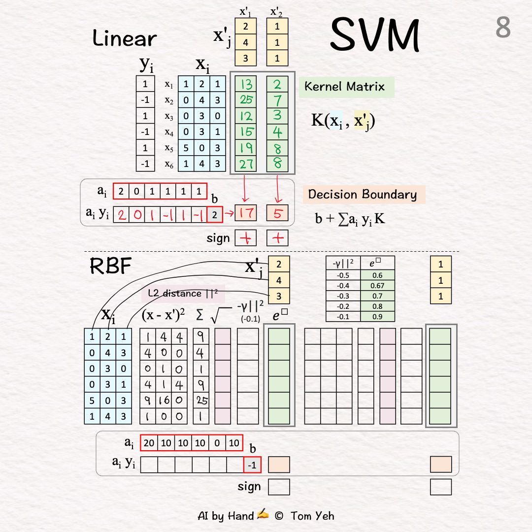↳ Multiply by gamma γ: The purpose is to control how much influence each training example has. A small gamma means each training example pulls the decision boundary more lightly, resulting in smoother decision boundaries.
