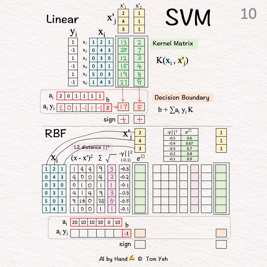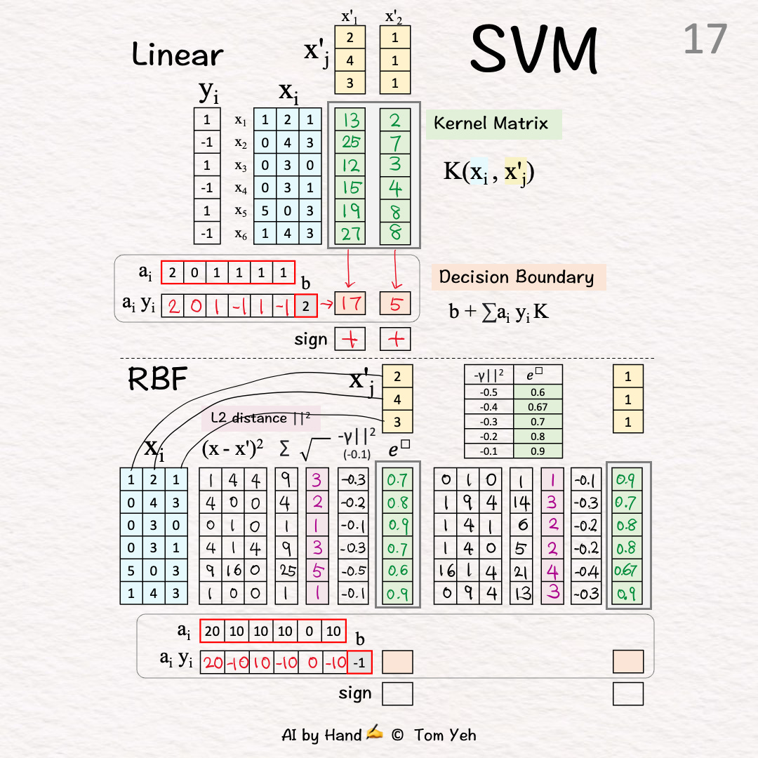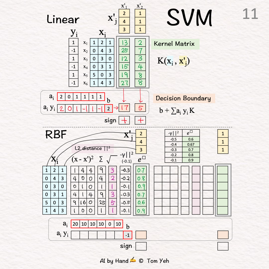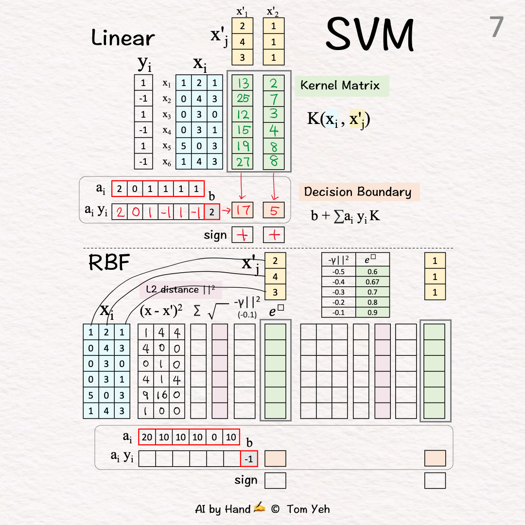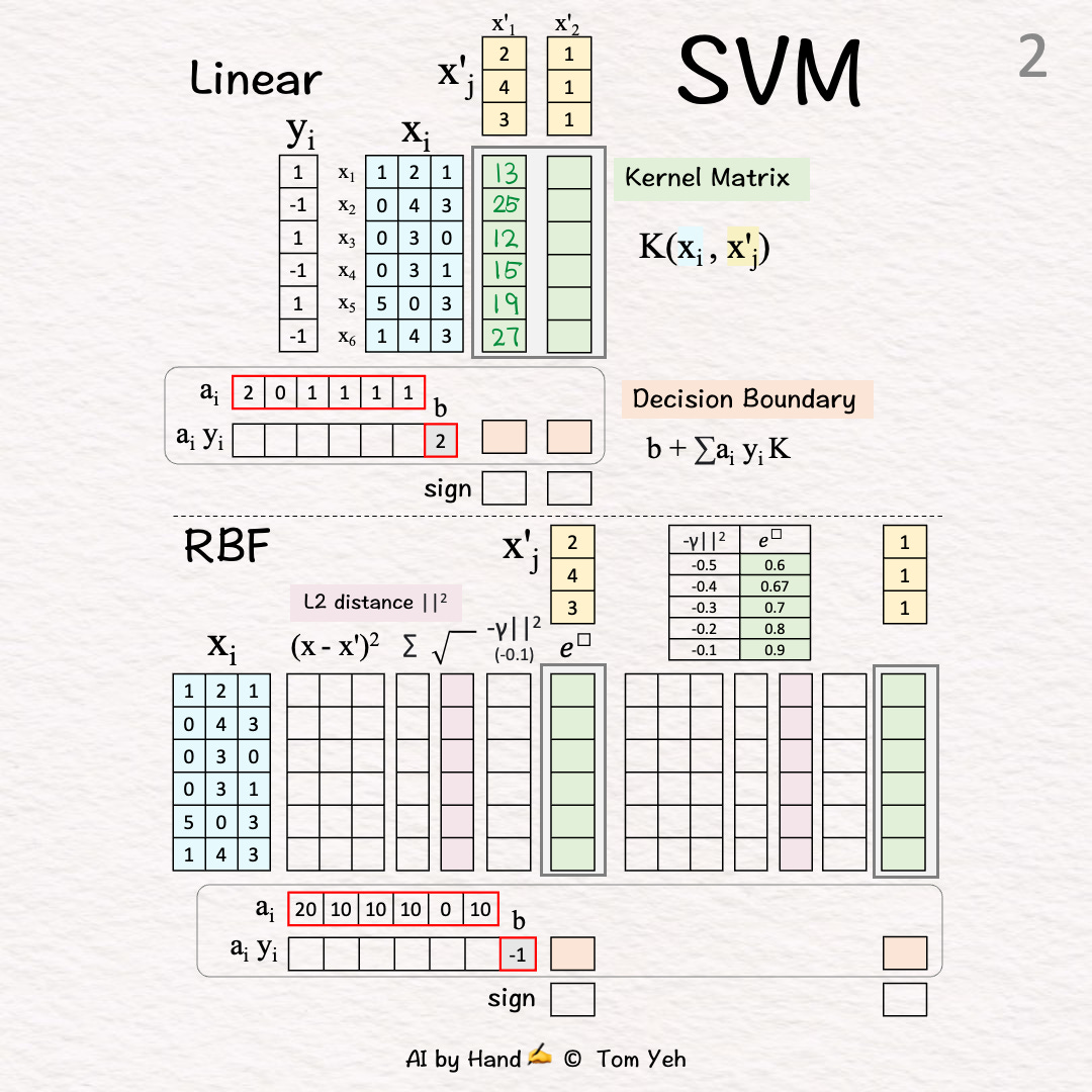 ↳ Multiply by gamma γ: The purpose is to control how much influence each training example has. A small gamma means each training example pulls the decision boundary more lightly, resulting in smoother decision boundaries.