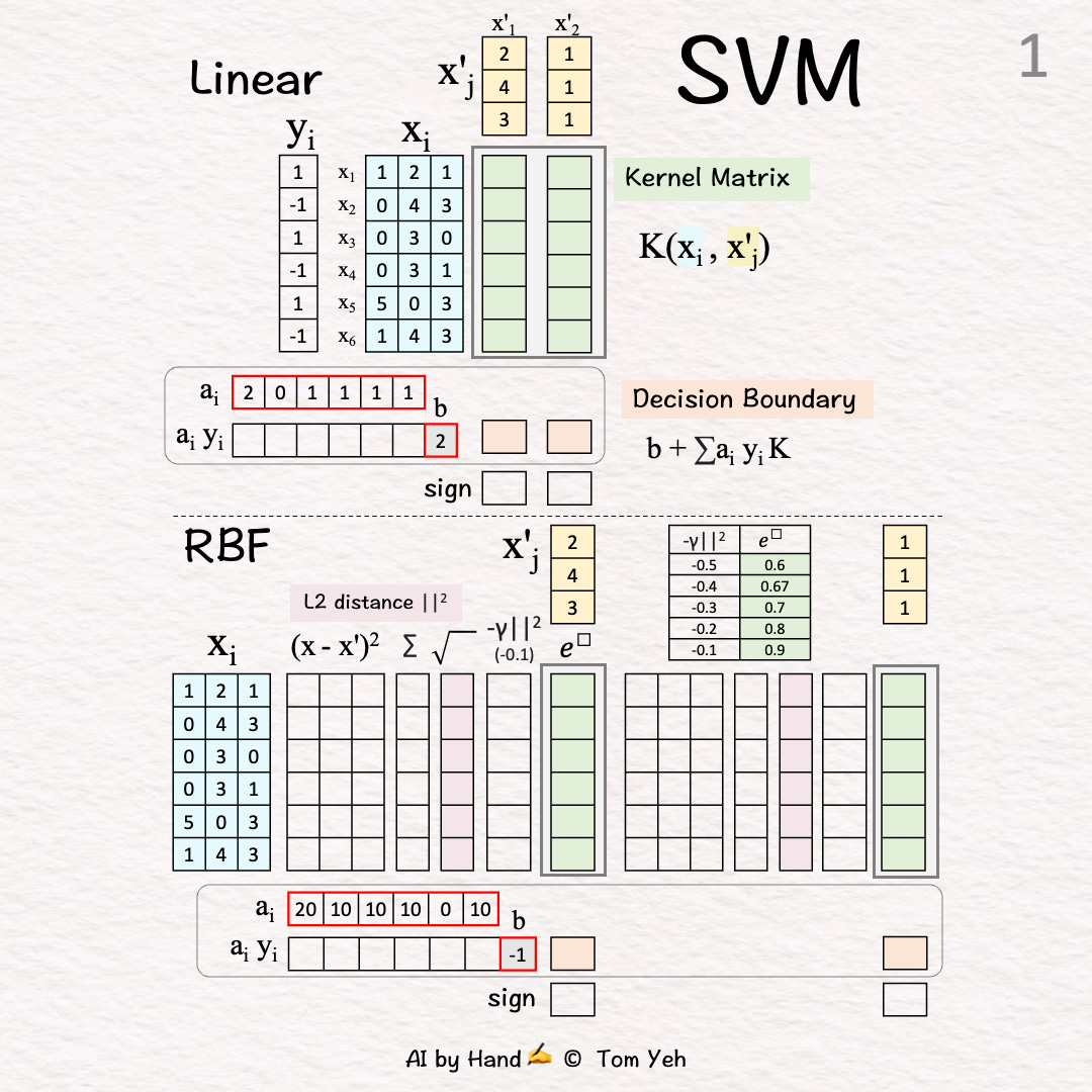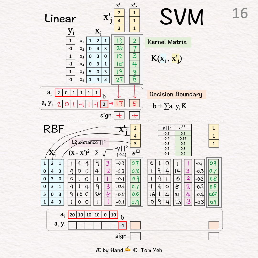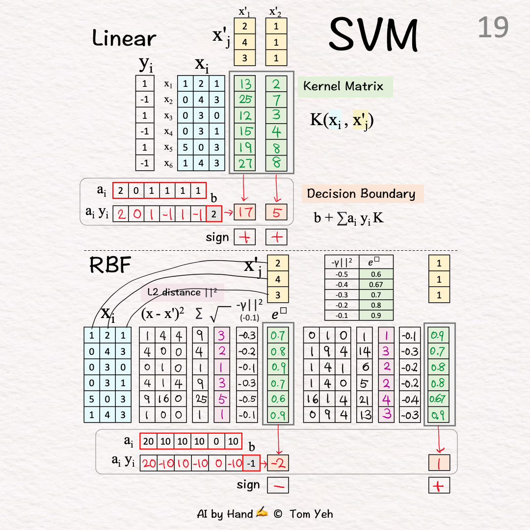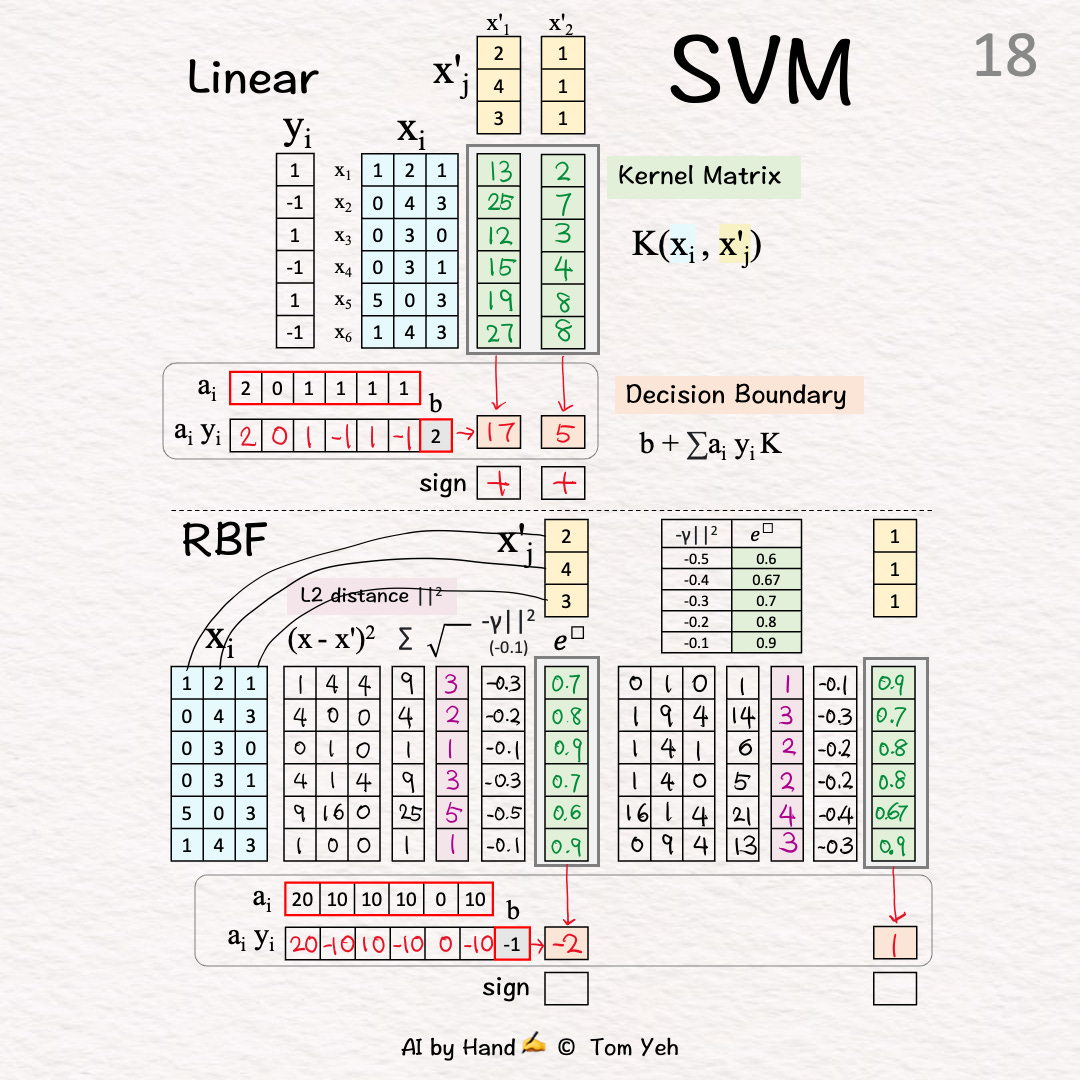 ↳ Multiply by gamma γ: The purpose is to control how much influence each training example has. A small gamma means each training example pulls the decision boundary more lightly, resulting in smoother decision boundaries.