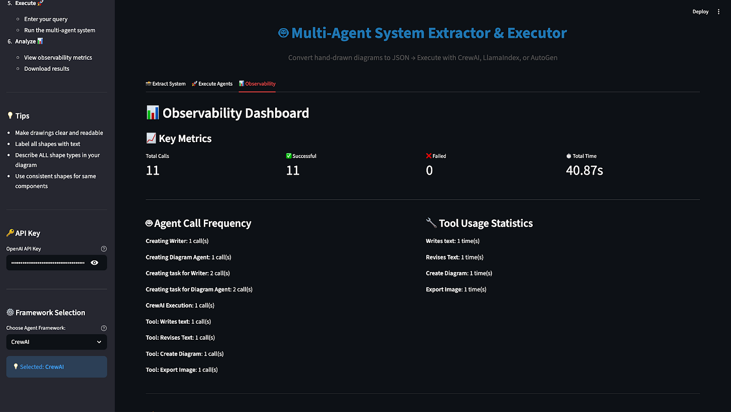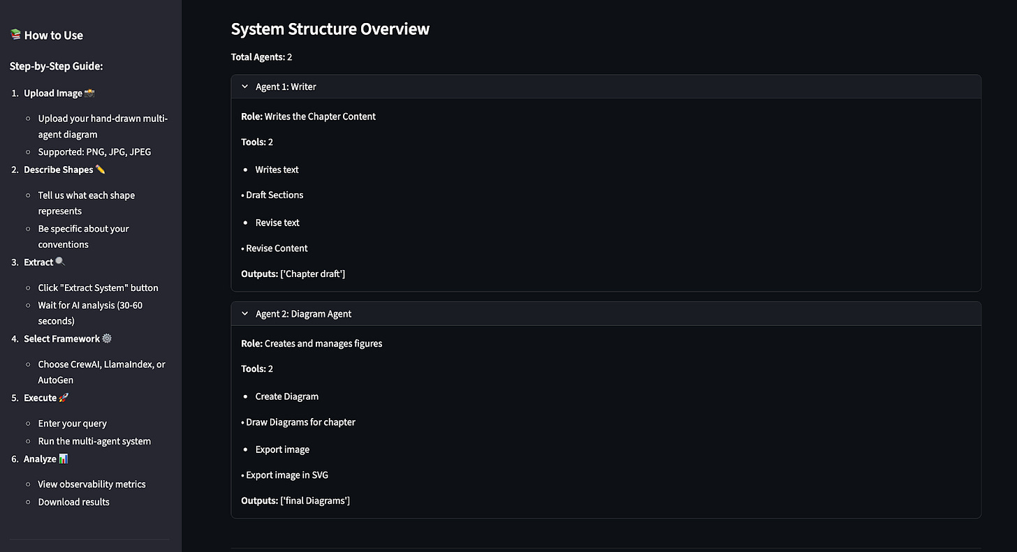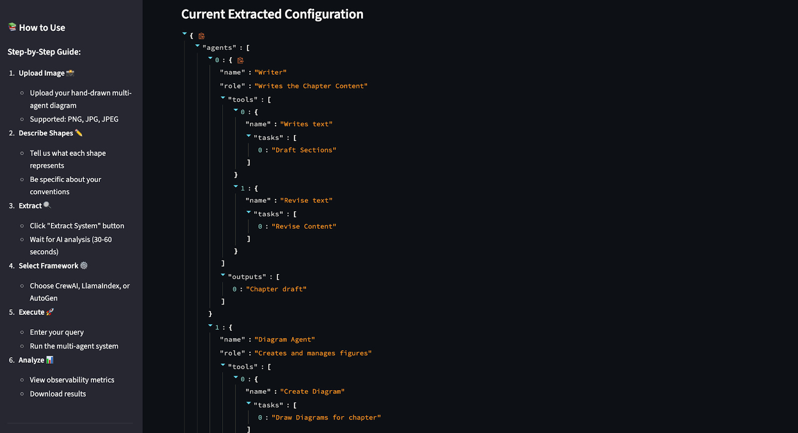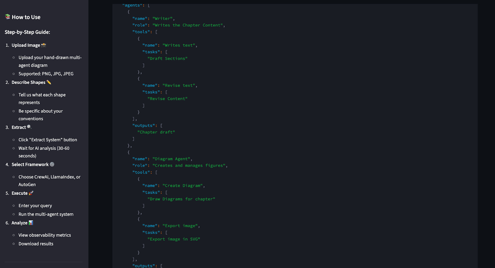 The system analyzes both the image and the instructions together and extracts an exact structured JSON representation of the system. You can inspect the raw JSON file, or a clean, structured view of agents, tools, tasks, and outputs. The drawing becomes data. The idea becomes structure.