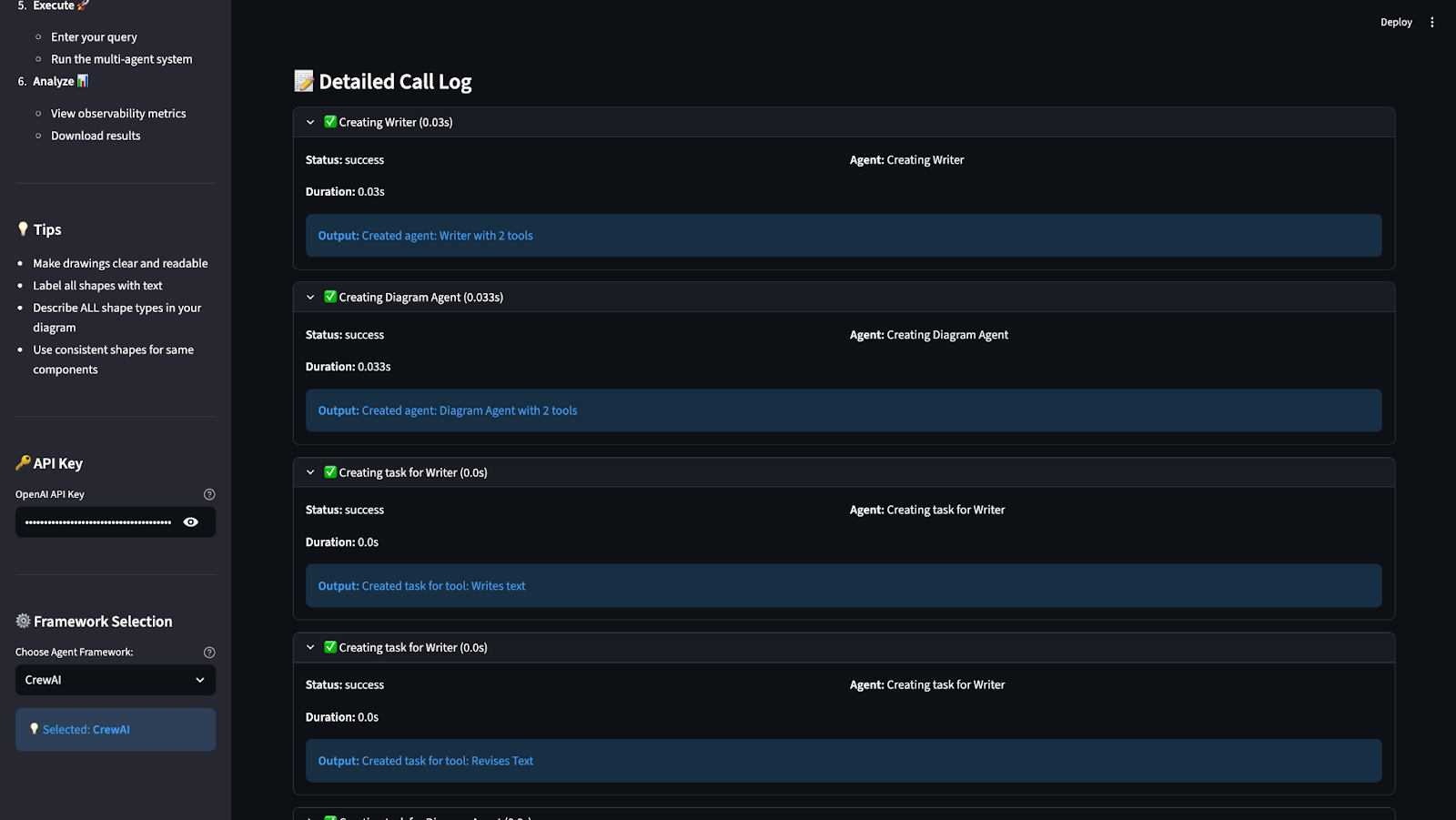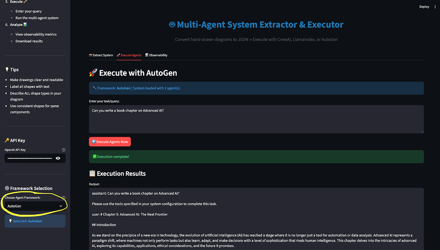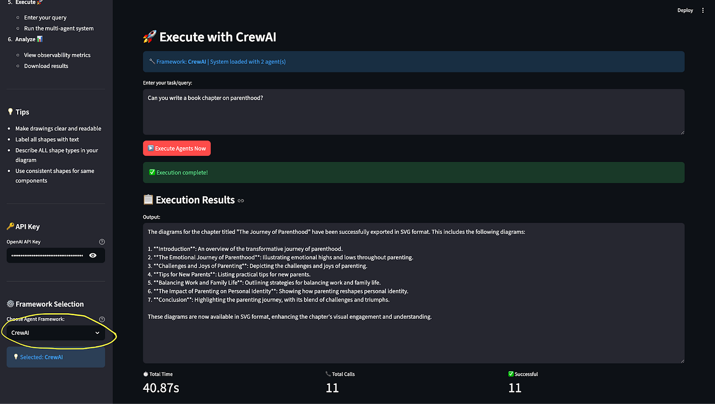 The system uses the exact same JSON to build an executable multi-agent system in the selected framework. (Internally, we discovered some compatibility challenges—LlamaIndex currently behaves differently from the other two due to OpenAI version mismatches—but the core idea remains intact.)