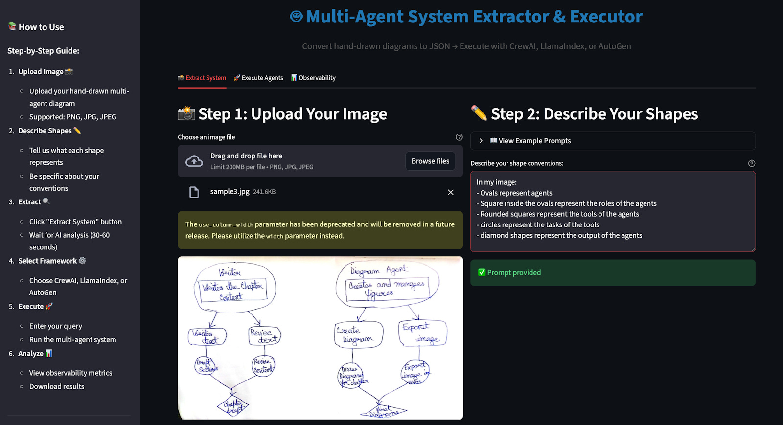 Here’s how we turn that drawing into something real. First, you upload a hand-drawn image of your agentic system. Then, you provide a short explanation of your drawing conventions: