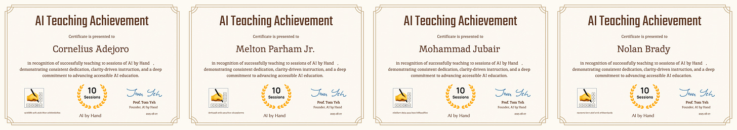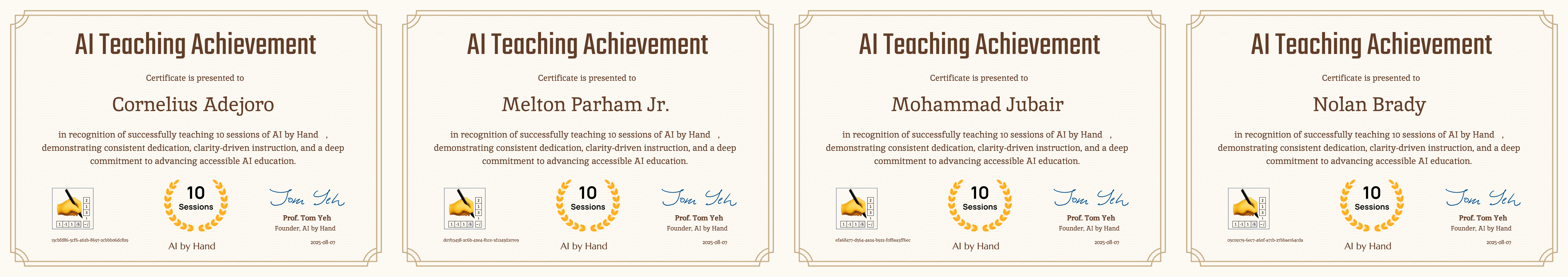 Awarded to educators who have taught more than 10 lessons of AI by Hand ✍️. This milestone honors those who carry forward our mission to teach AI by hand to 1 million people worldwide, turning complex ideas into clarity and inspiring others to do the same.