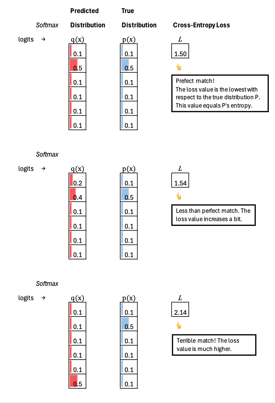 Cross Entropy Loss measures how well the model’s predicted distribution Q matches the true distribution P. The predicted model distribution usually comes from a softmax applied to the logits (the raw scores produced by the model), while the true distribution usually comes from labeled data. A low cross entropy value means the model is assigning high probability to what actually occurs in the ground truth, indicating close alignment between the predicted and true distributions. A high cross entropy value means the model is assigning low probability to what actually occurs, indicating a large mismatch between the predicted distribution and the true distribution.