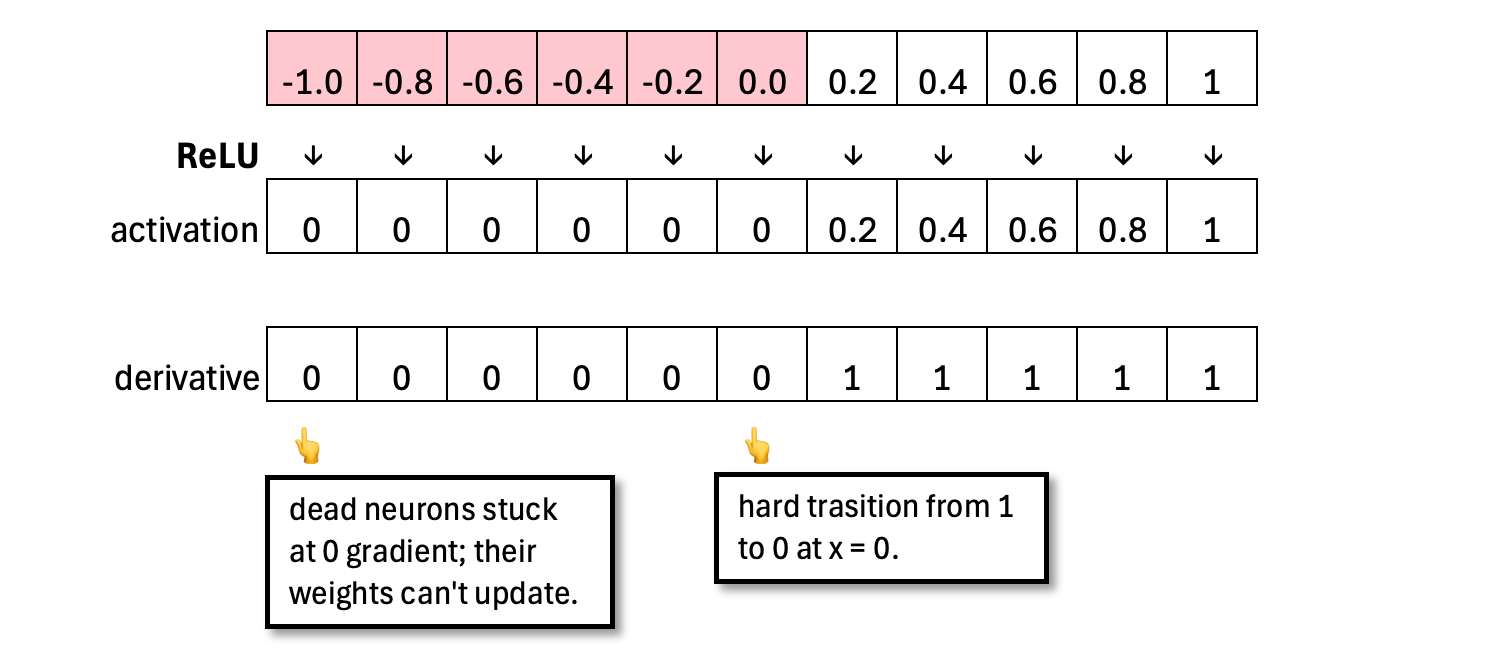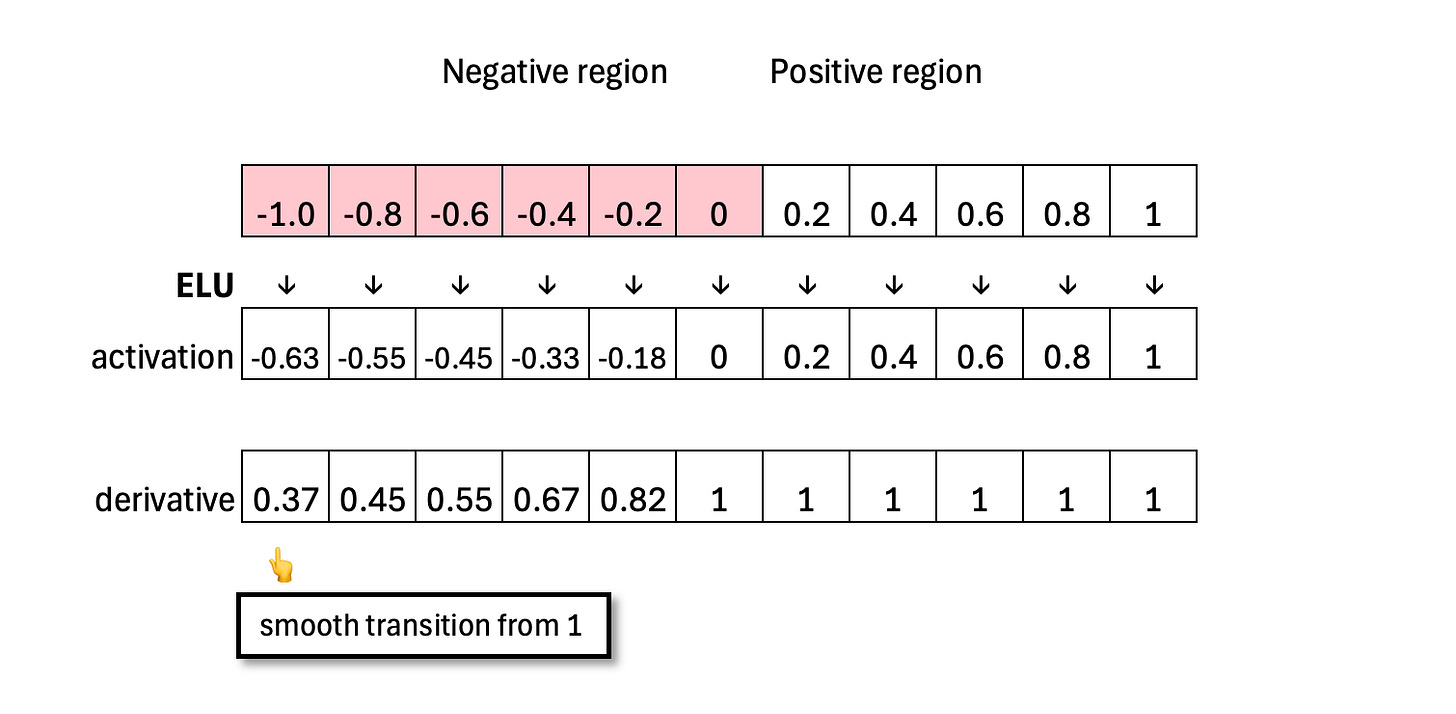 ELU behaves like ReLU in the positive region, passing positive inputs through unchanged. But in ReLU, a neuron can become “dead” in the negative region because the gradient is zero, meaning it receives no signal to update. Like LeakyReLU, ELU keeps the negative region alive by providing small, nonzero gradients. This allows a “dead” neuron to slowly recover, rather than remaining permanently silent.