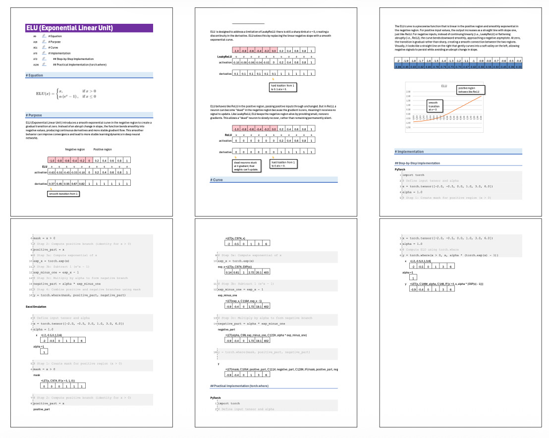 ELU is designed to address a limitation of LeakyReLU: there is still a sharp kink at x = 0, creating a discontinuity in the derivative. ELU solves this by replacing the linear negative slope with a smooth exponential curve.