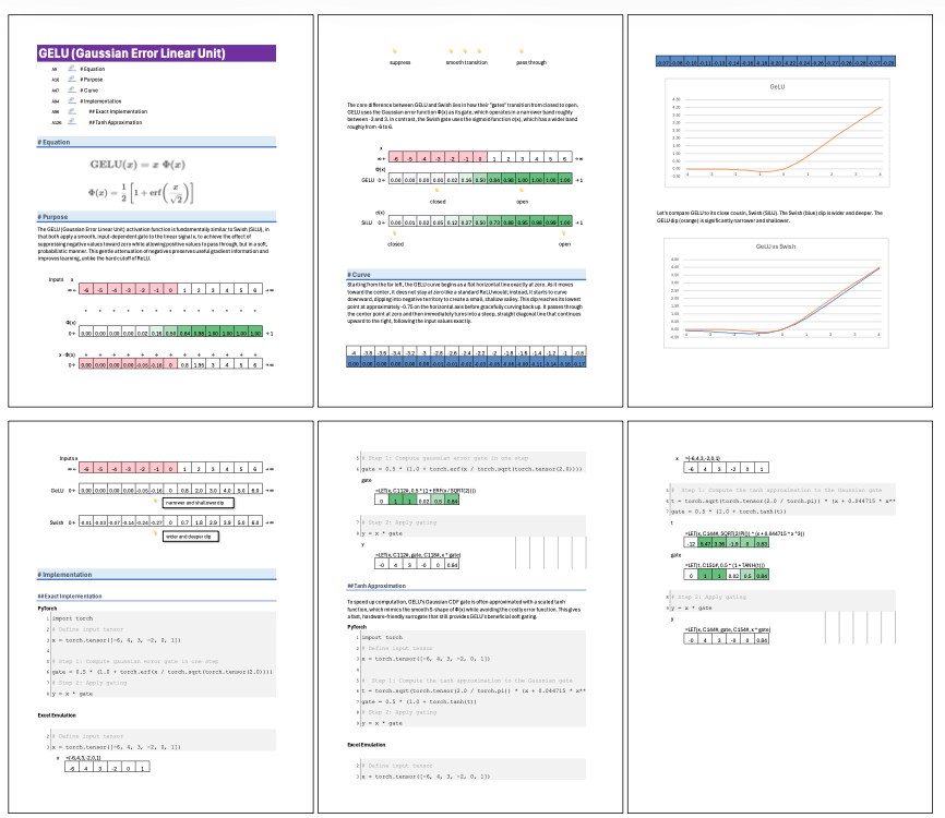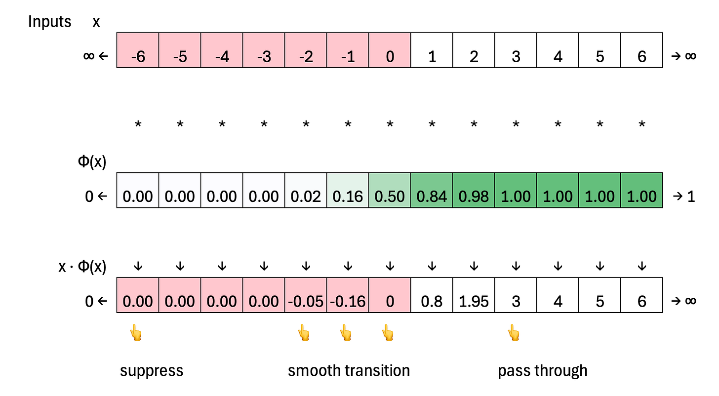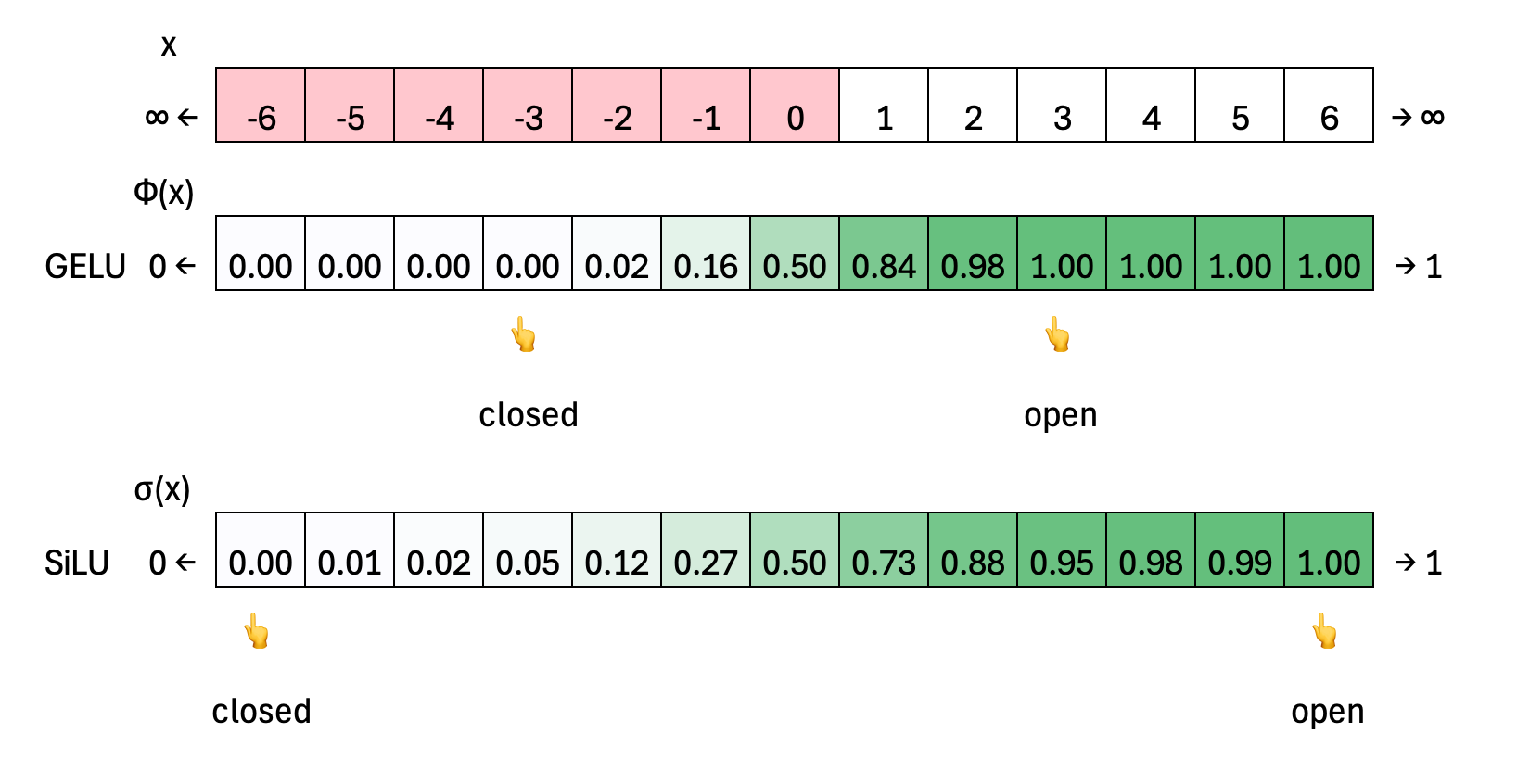 The core difference between GELU and Swish lies in how their “gates” transition from closed to open. GELU uses the Gaussian error function Φ(x) as its gate, which operates in a narrower band roughly between -3 and 3. In contrast, the Swish gate uses the sigmoid function σ(x), which has a wider band roughly from -6 to 6.