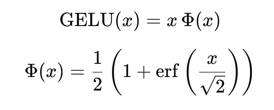 The GELU (Gaussian Error Linear Unit) activation function is fundamentally similar to Swish (SiLU), in that both apply a smooth, input‑dependent gate to the linear signal x, to achieve the effect of suppressing negative values toward zero while allowing positive values to pass through, but in a soft, probabilistic manner. This gentle attenuation of negatives preserves useful gradient information and improves learning, unlike the hard cutoff of ReLU.