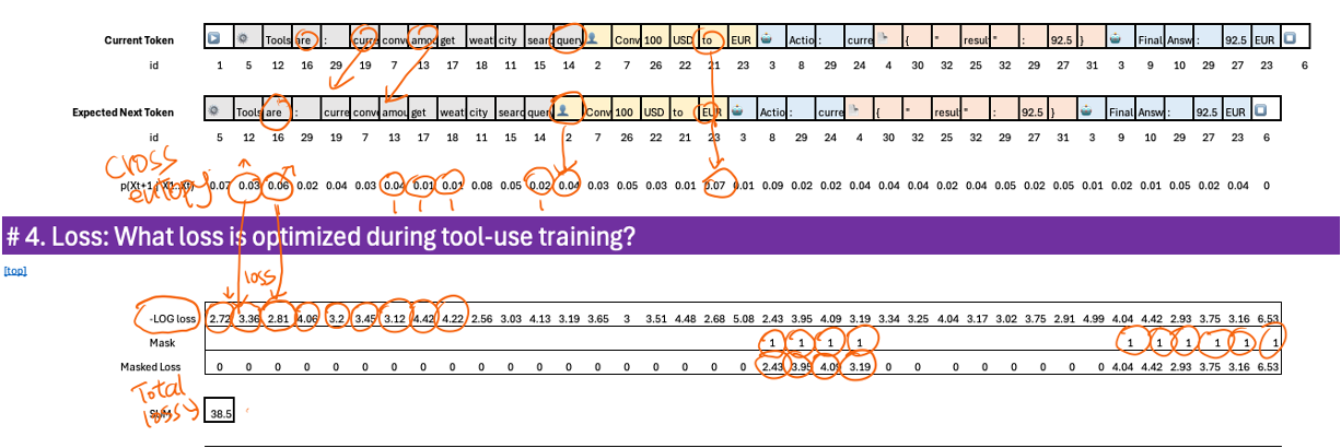 Tool calling is still next-token predictionâbut now the ârightâ tokens represent actions and parameters. I illustrated the full pipeline, from flattening message trajectories into a single sequence, through embeddings, projections, softmax, and cross-entropy loss. The key technical insight is masking: during fine-tuning, loss is applied only to assistant tokensâthe points where tool decisions are made. System and user tokens are ignored, which keeps training focused and efficient.