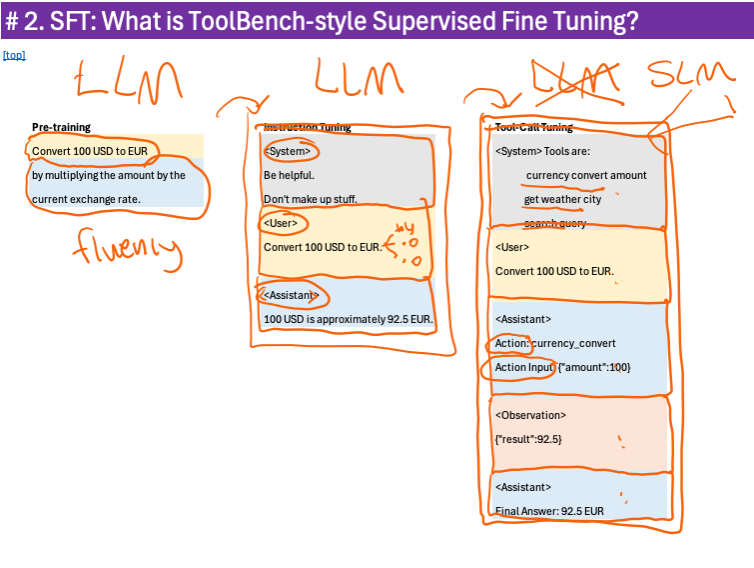 I walked through the training progression from pre-training, to instruction tuning, to tool-calling fine-tuning.