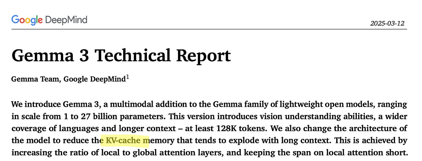 Back in March, Google dropped Gemma 3. In the abstract, one line jumps out to me: “reduces KV cache memory.” Not benchmarks—cache math. That’s the headline.