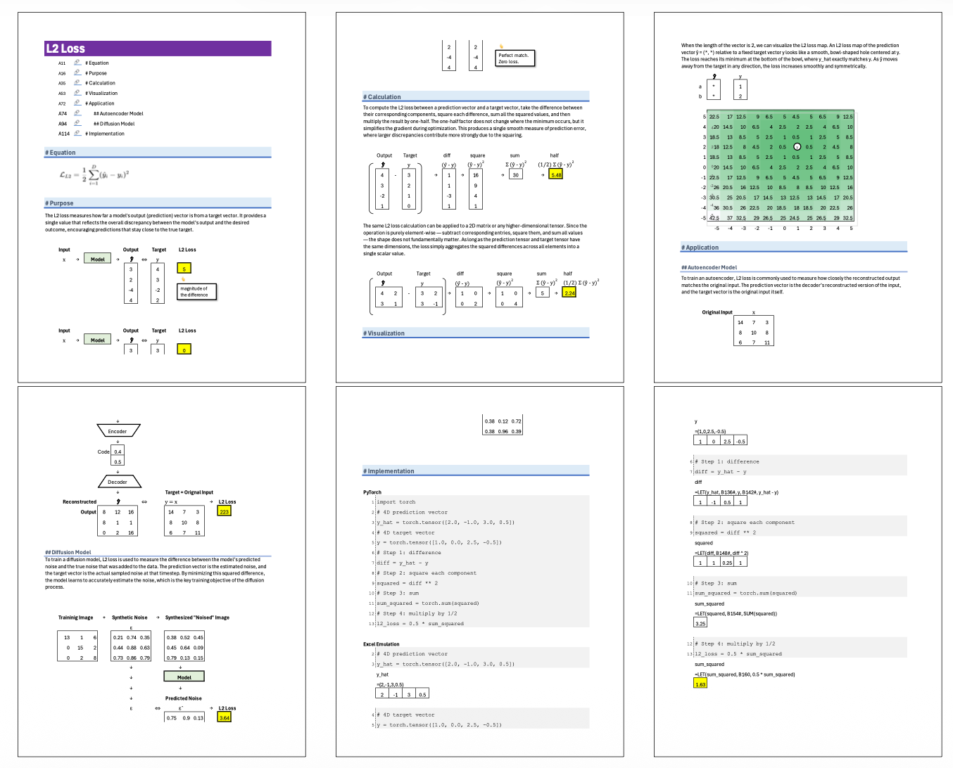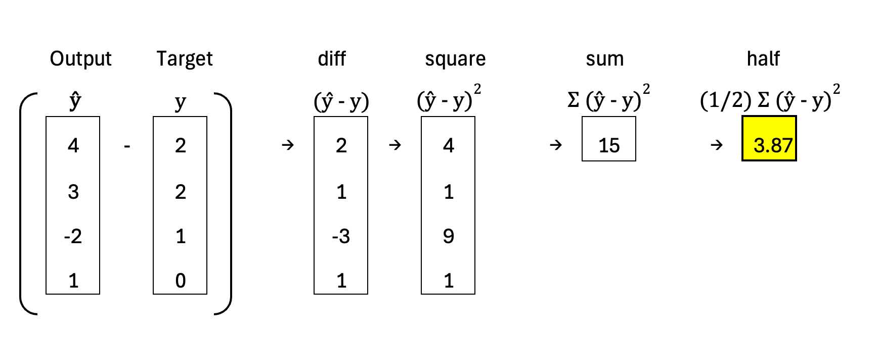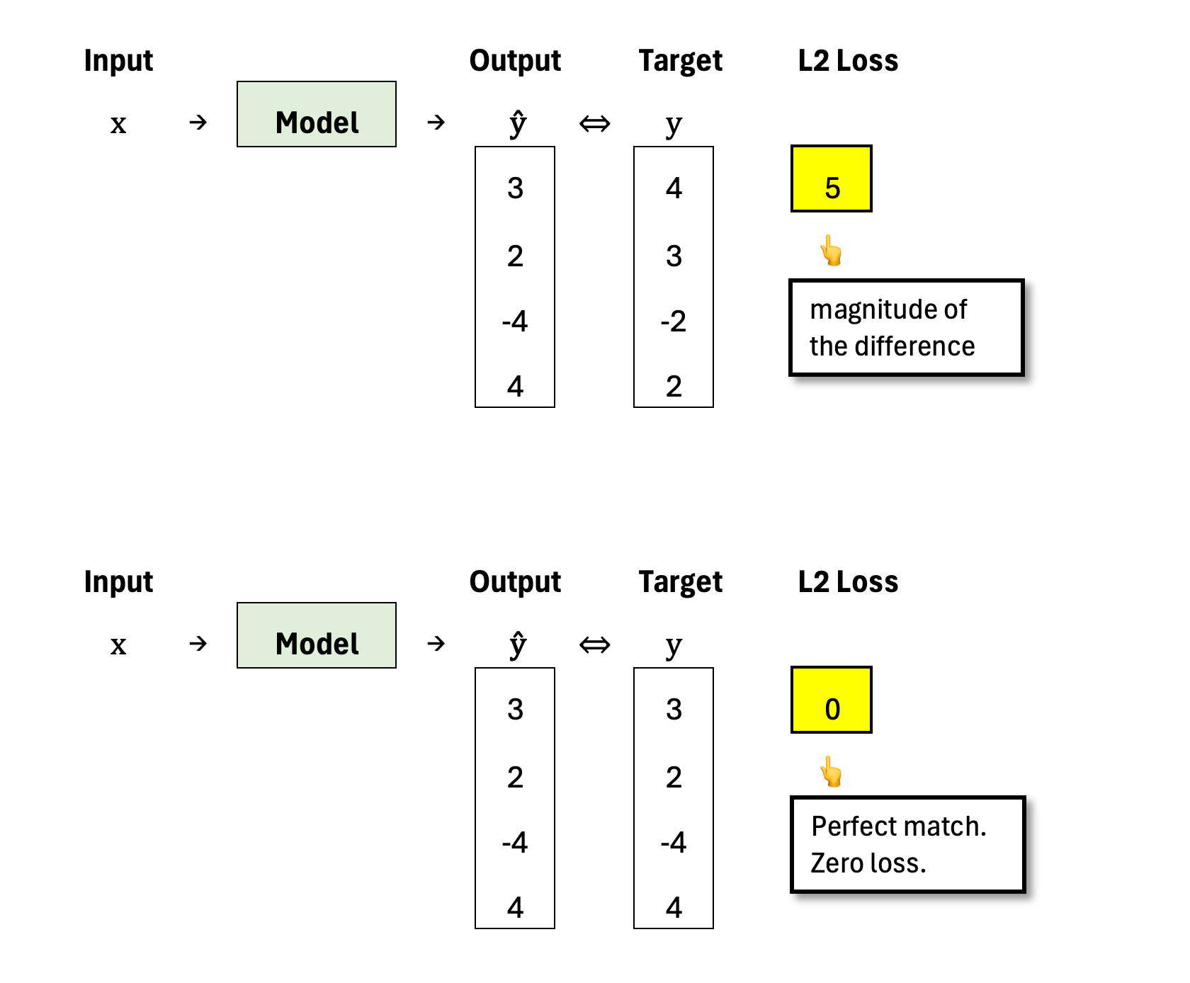 The L2 loss measures how far a model’s output (prediction) vector is from a target vector. It provides a single value that reflects the overall discrepancy between the model’s output and the desired outcome, encouraging predictions that stay close to the true target.