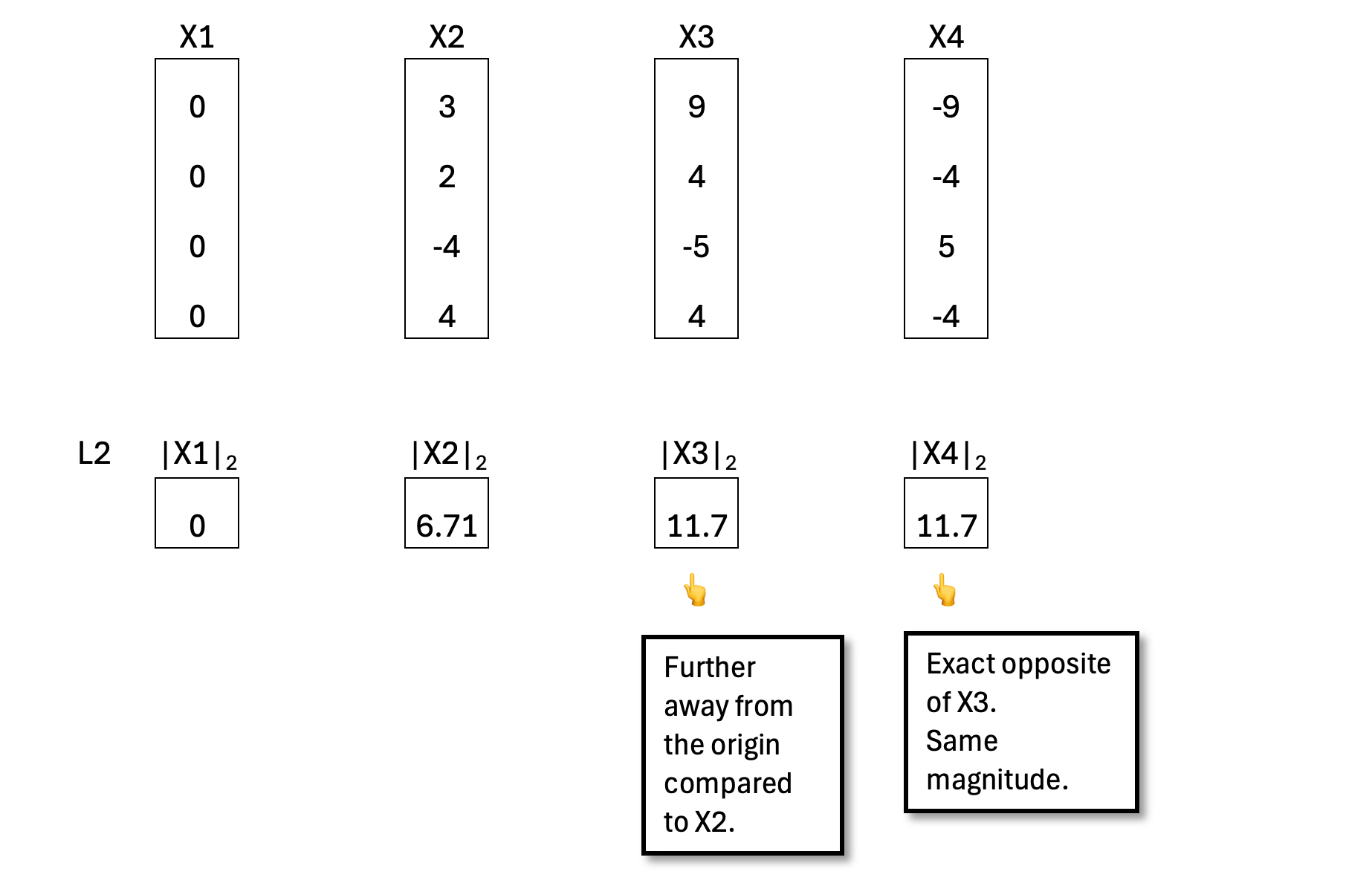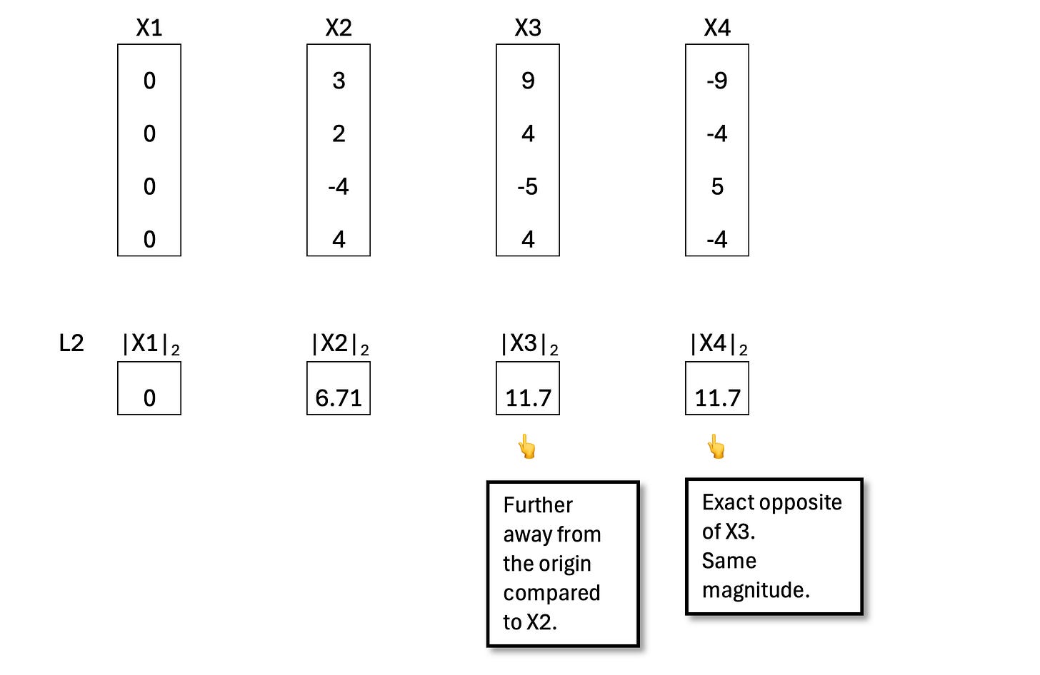 The L2 norm gives a single number that represents the magnitude of a vector. It tells us how far a point is from the origin.