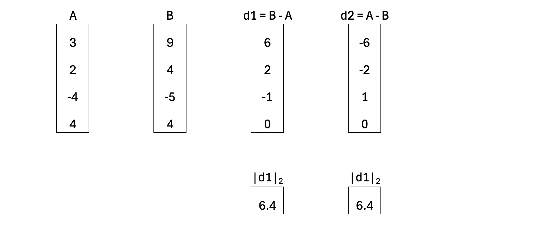 When we apply the L2 norm to the difference between two vectors, it gives the straight-line (Euclidean) distance between them. For example, the displacement vectors d1 = B − A and d2 = A − B point in opposite directions, but their magnitudes are identical, so they yield the same distance between A and B. This symmetry is why the L2 norm is a natural and widely used way to measure size, error, or deviation in a continuous space, linking algebraic vector operations to clear geometric intuition.