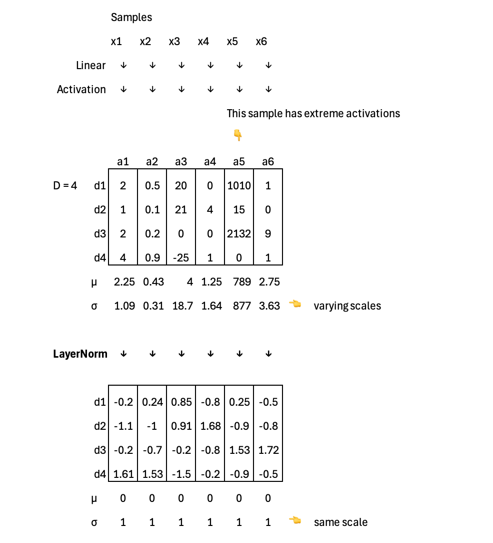 Layer normalization is used to stabilize training when individual samples exhibit extreme activations and highly varying scales within a layer. For a given input, some features may spike to very large values while others remain small, causing a single sample’s activation vector to be poorly scaled and dominated by a few components. Layer normalization computes statistics across features within each sample, rescaling activations to a consistent scale so no single feature overwhelms the computation in that forward pass. This makes optimization more stable and is especially effective when mini-batch sizes are small or batch statistics are unreliable.