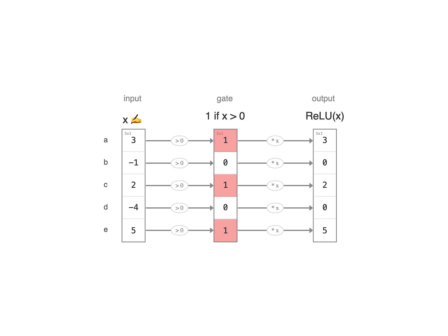 Five rows means five parallel shops on the same block, each evaluated independently. That's why ReLU is called an element-wise activation: every neuron decides its own fate.