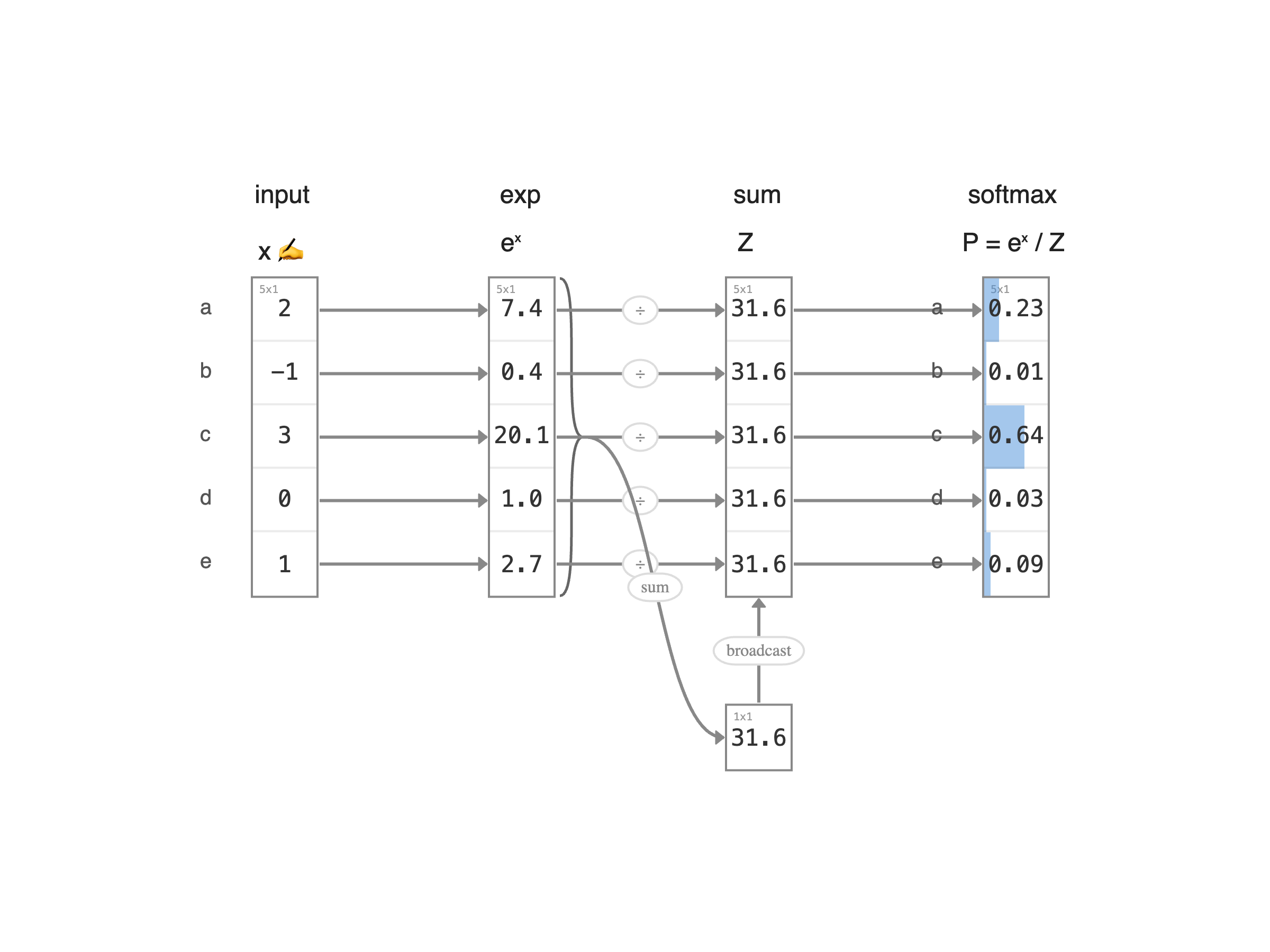 Read the diagram left to right. First, raise each score to e^{x} — this does two things: it turns negative chewiness into small positives, and it stretches the gaps between scores exponentially. Then sum all five into a single total Z. Finally, divide each e^{x} by Z to get a probability. The five probabilities add up to one, so you can read them as percentages of your dollar. The chewiest shop gets the biggest slice — but never the whole dollar. That's the point of softmax: it ranks confidently while still leaving room for the others.