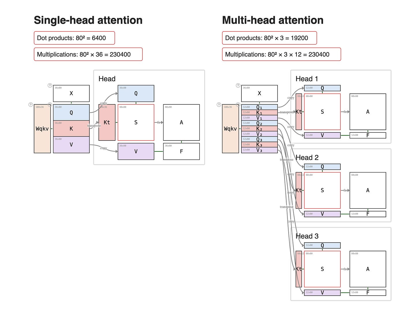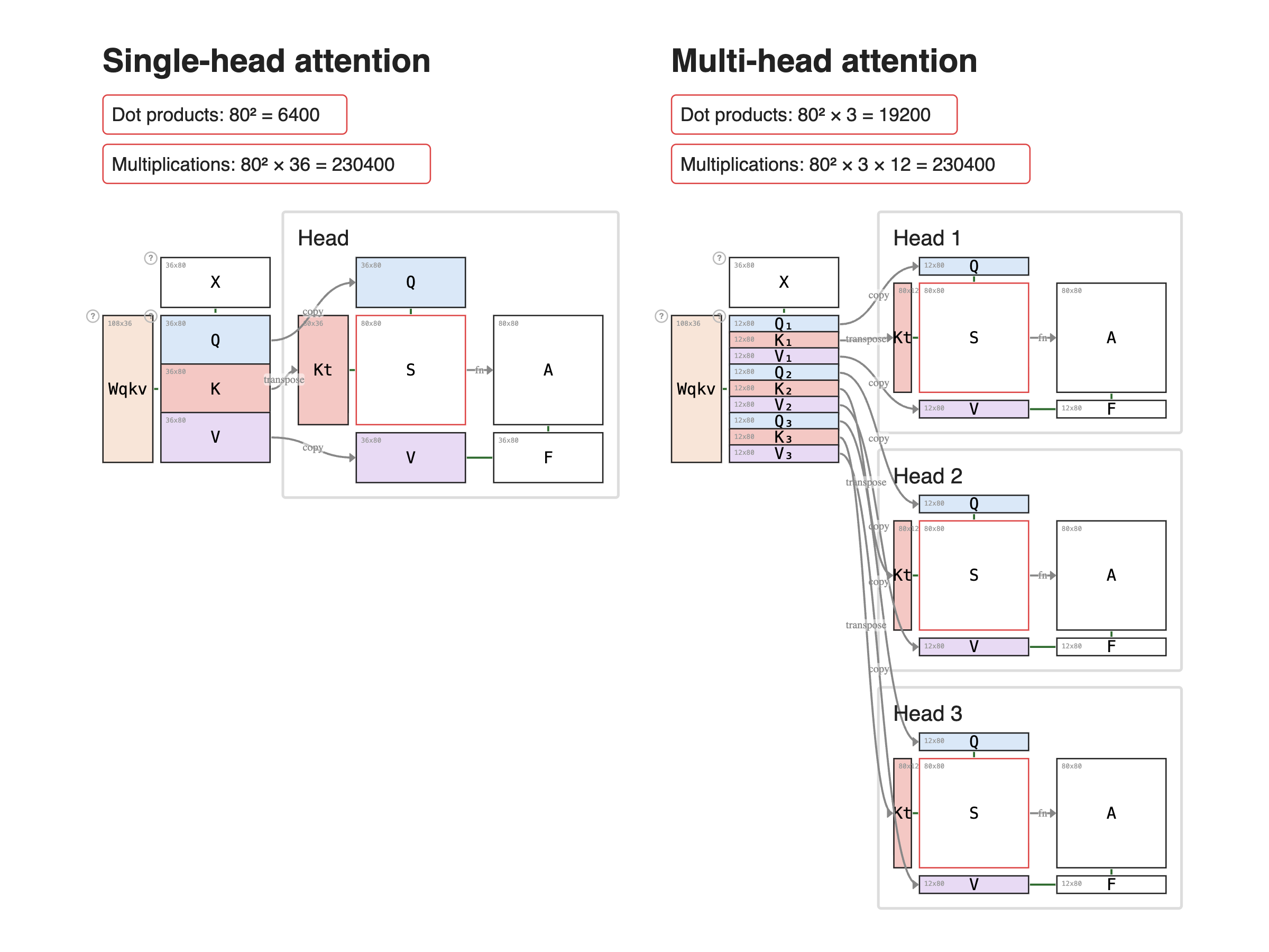 Multi-head: seq × seq × H = 80² × 3 = 19200 dot products (3×)
