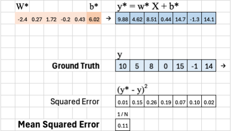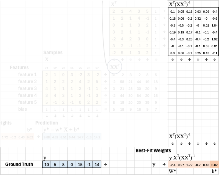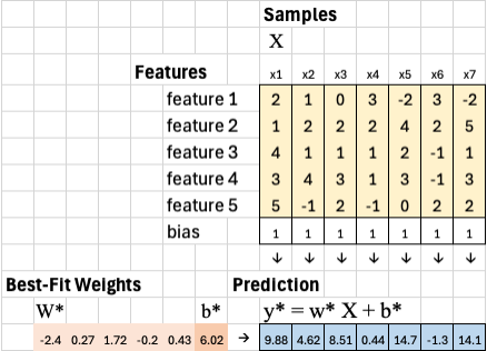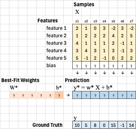 The goal is to find the set of weights that best fit the relationship between our input features and the ground truth values. In other words, we want to determine how much each feature contributes to predicting y* to be as close to ground truth values y as possible. Once we express this relationship in matrix form, we can solve for those optimal weights using a series of simple linear algebra steps.