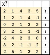 To include a bias term, we add one extra row of ones to X. The new matrix now has 6 rows and 7 columns. The bias row allows the model to learn an intercept in addition to feature weights.