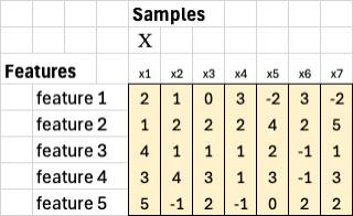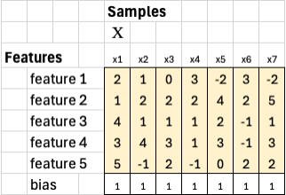 Each sample has five features. This means our feature matrix X has 5 rows and 7 columns — five features by seven samples. Each column corresponds to a single example, and each row represents one feature across all samples.
