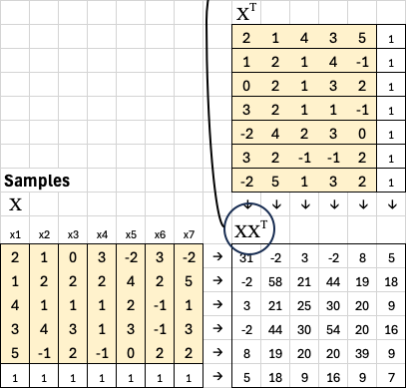 We then multiply X by its transpose: XX^T. Since X is 6x7 and X^T is 7x6, the result XX^T is a 6x6 matrix. This captures how the features co-vary across the dataset and is often called the covariance matrix.
