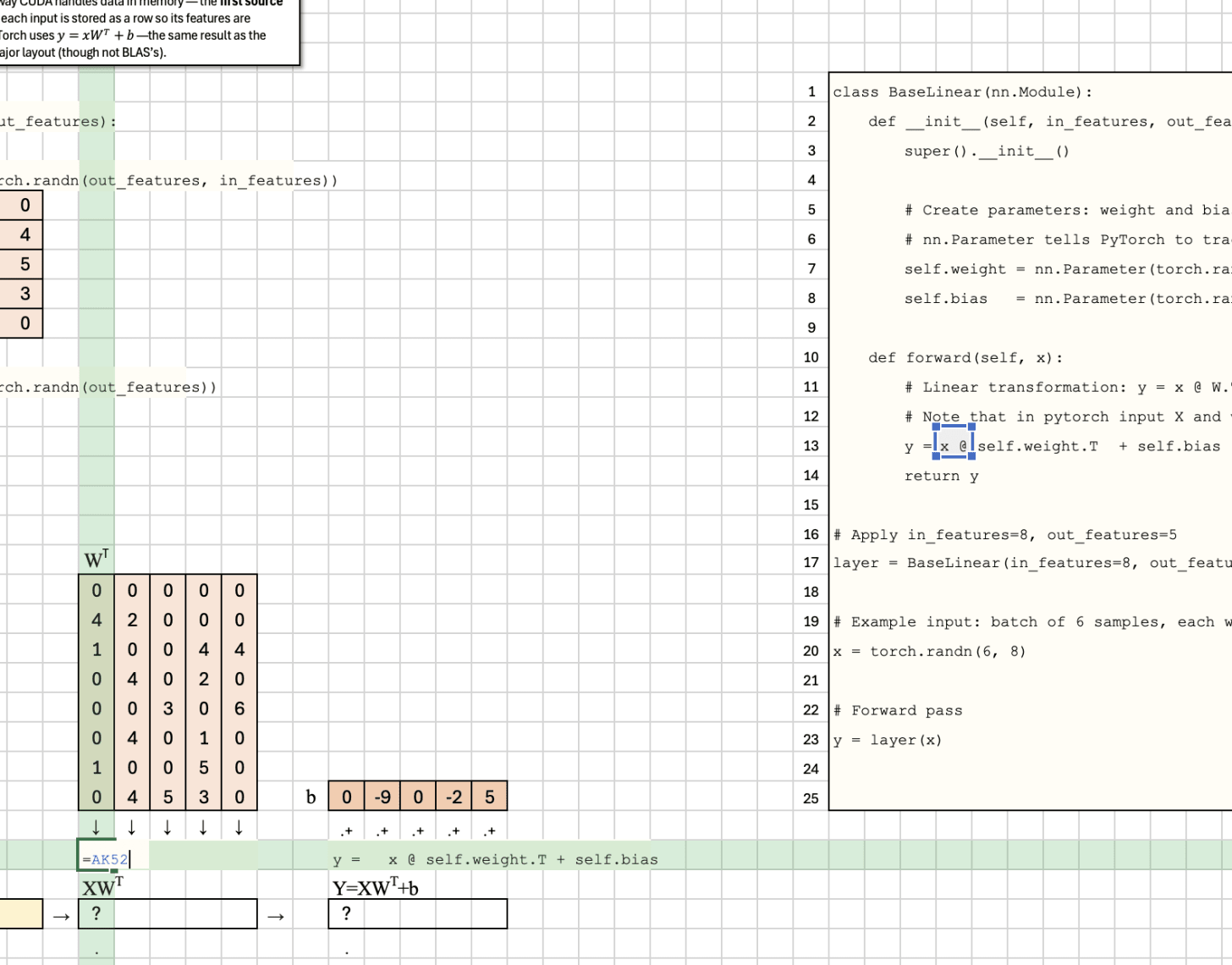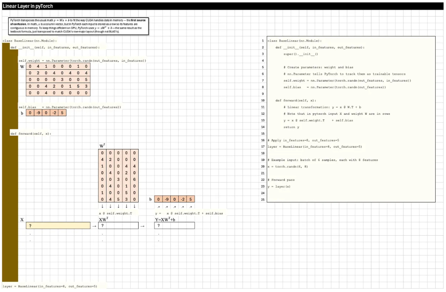 PyTorch transposes the usual math y=Wx+b to fit the way CUDA handles data in memory — the first source of confusion. In math, x is a column vector, but in PyTorch each input is stored as a row so its features are contiguous in memory. To keep things efficient on GPU, PyTorch uses y=xW^T+b— the same result as the textbook formula, just transposed to match CUDA’s row-major layout (though not BLAS’s).