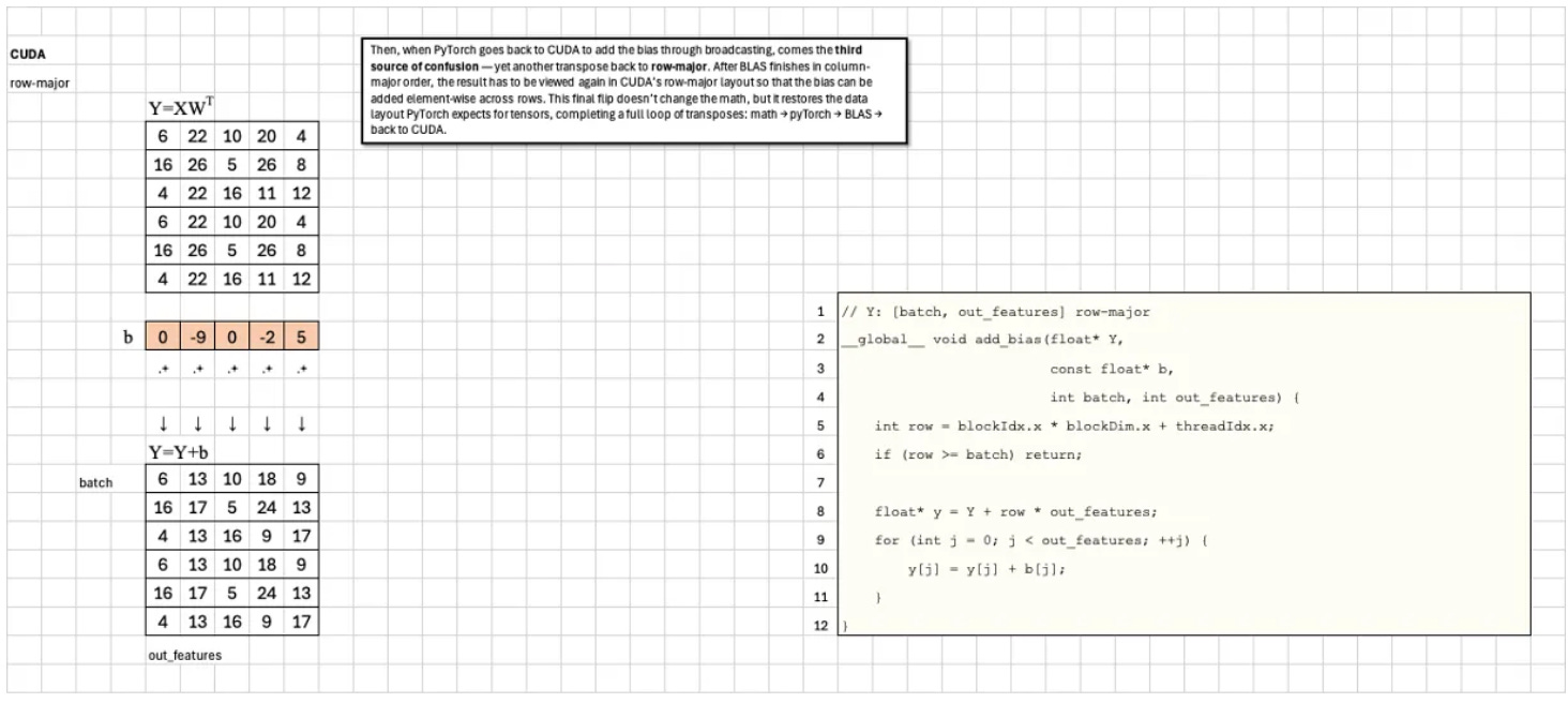Then, when PyTorch goes back to CUDA to add the bias through broadcasting, comes the third source of confusion — yet another transpose back to row-major. After BLAS finishes in column-major order, the result has to be viewed again in CUDA’s row-major layout so that the bias can be added element-wise across rows. This final flip doesn’t change the math, but it restores the data layout PyTorch expects for tensors, completing a full loop of transposes: math → PyTorch → BLAS → CUDA → PyTorch.