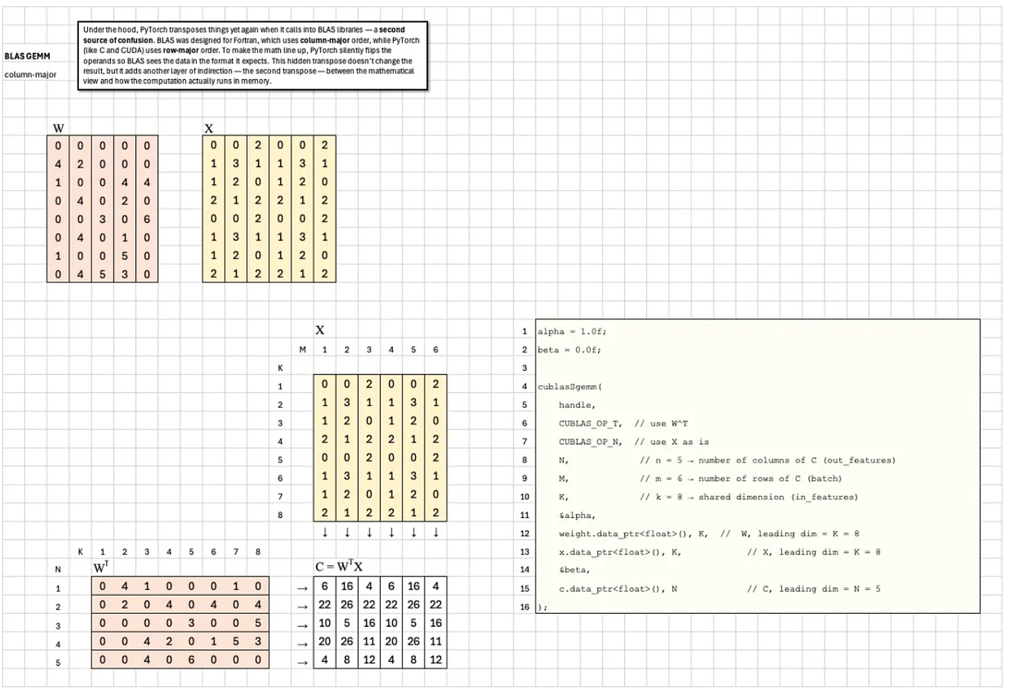 Under the hood, PyTorch transposes things yet again when it calls into BLAS libraries — a second source of confusion. BLAS was designed for Fortran, which uses column-major order, while PyTorch (like C and CUDA) uses row-major order. To make the math line up, PyTorch silently flips the operands so BLAS sees the data in the format it expects. This hidden transpose doesn’t change the result, but it adds another layer of indirection — the second transpose — between the mathematical view and how the computation actually runs in memory.