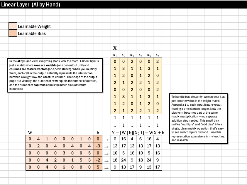 In the AI by Hand ✍️ view, everything starts with the math. A linear layer is just a matrix where rows are weights (one per output unit) and columns are feature vectors (one per instance). When you multiply them, each cell in the output naturally represents the intersection between a weight row and a feature column. The shape of the output pops out visually: the number of rows equals the number of outputs, and the number of columns equals the batch size (or feature instances).