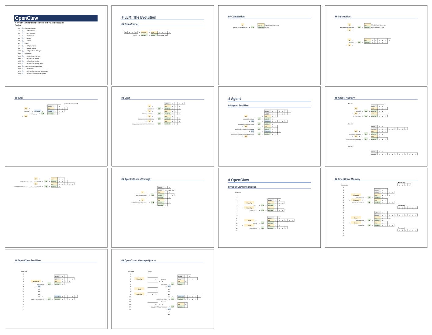 This is just one of the many amazing diagrams Andrei created through his slog, a sharp contrast with weekend vibe-coding projects like OpenClaw. I asked Andrei to do a live walkthrough of this diagram during the seminar. He graciously agreed. He walked us through the full tool-calling lifecycle: the LLM produces a tool request in text, a separate runtime executes it, and the result is fed back into the conversation for synthesis. This becomes a complete framework—runtime, processing loop, tools, memory, and model integrations—culminating in a local personal assistant, an OpenClaw-style system built entirely from first principles.