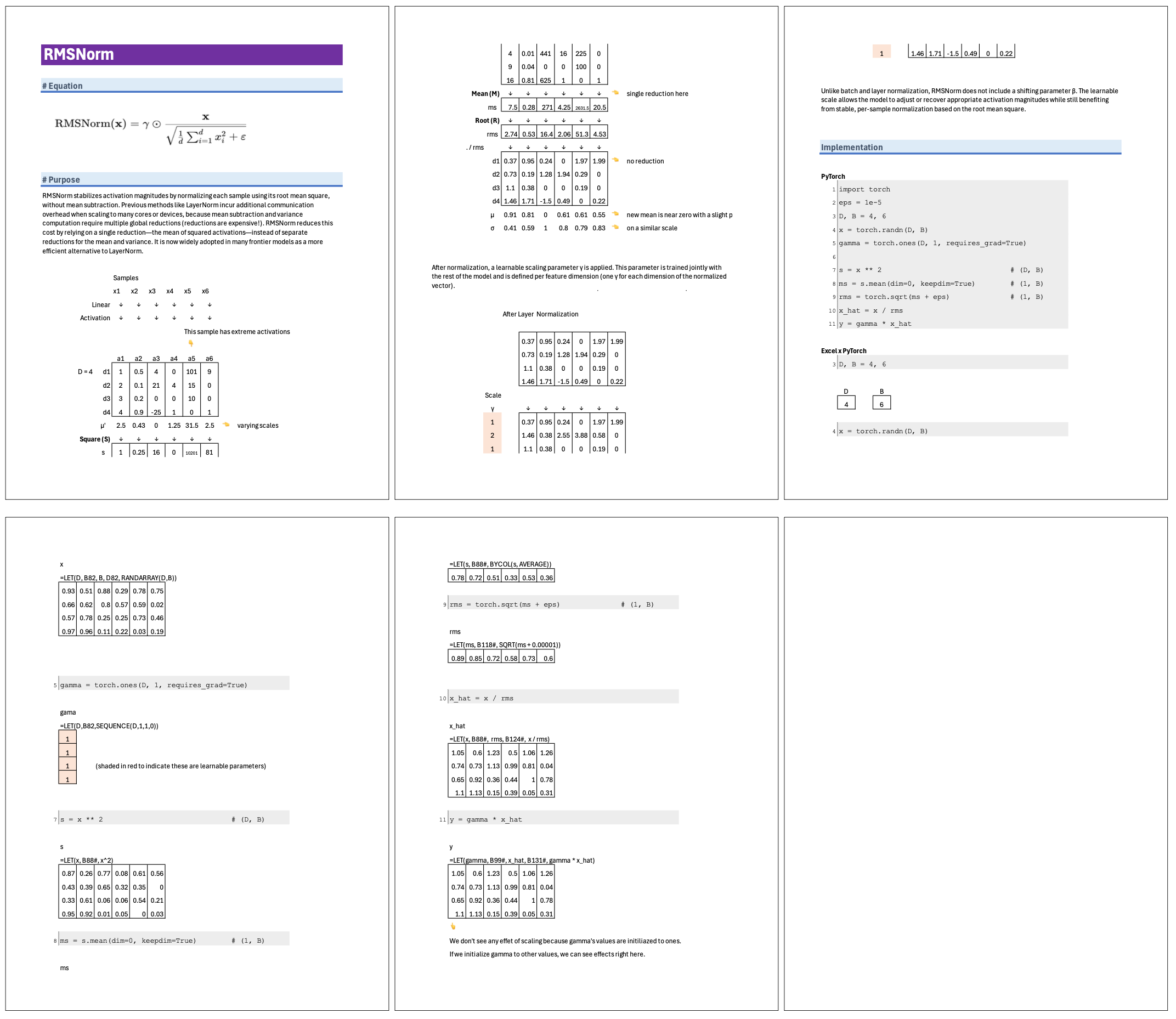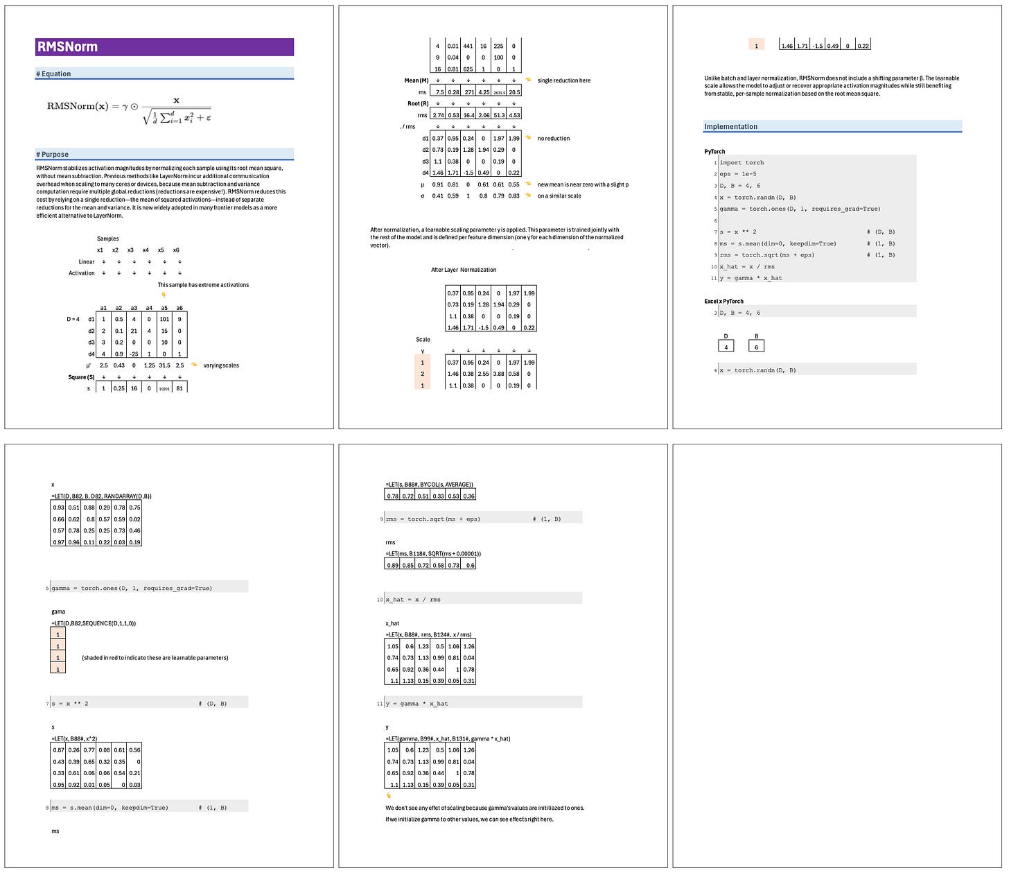 Root-Mean-Square Normalization (RMSNorm) stabilizes activation magnitudes by normalizing each sample using its root mean square, without mean subtraction. Previous methods like LayerNorm incur additional communication overhead when scaling to many cores or devices, because mean subtraction and variance computation require multiple global reductions (reductions are expensive!). RMSNorm reduces this cost by relying on a single reduction—the mean of squared activations—instead of separate reductions for the mean and variance. It is now widely adopted in many frontier models as a more efficient alternative to LayerNorm.
