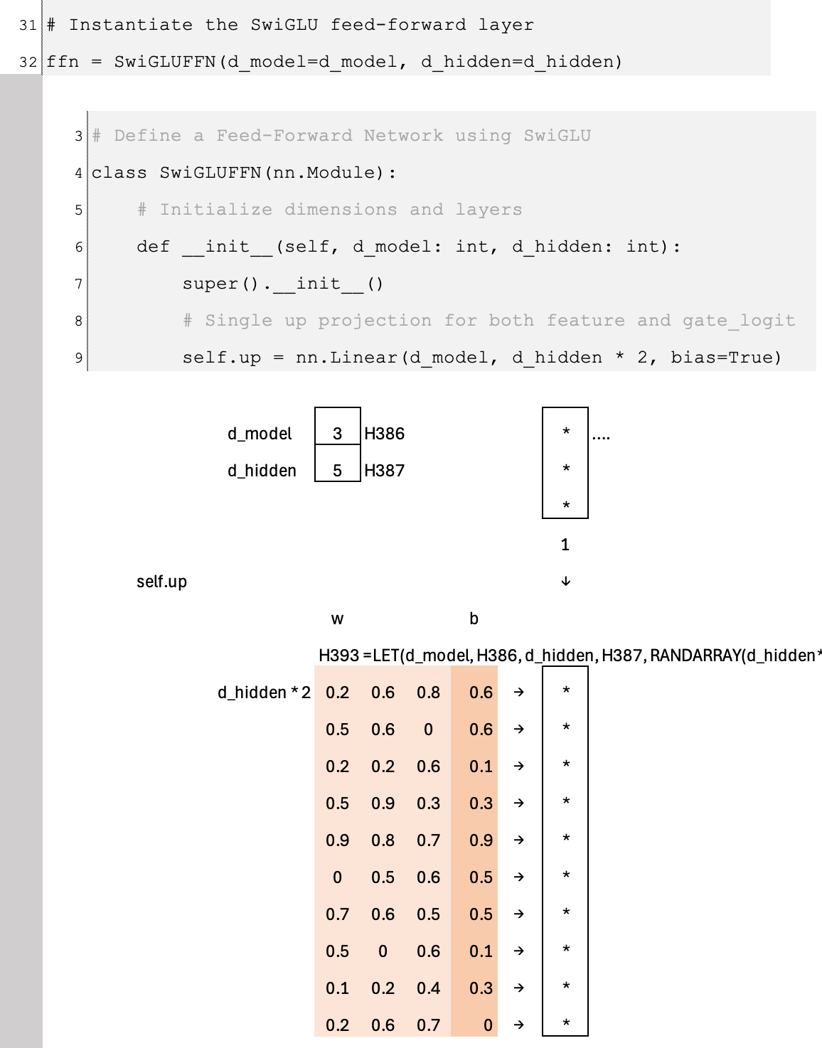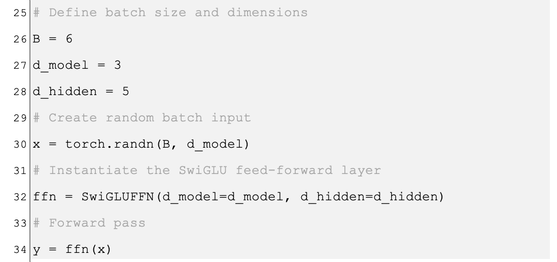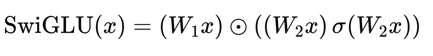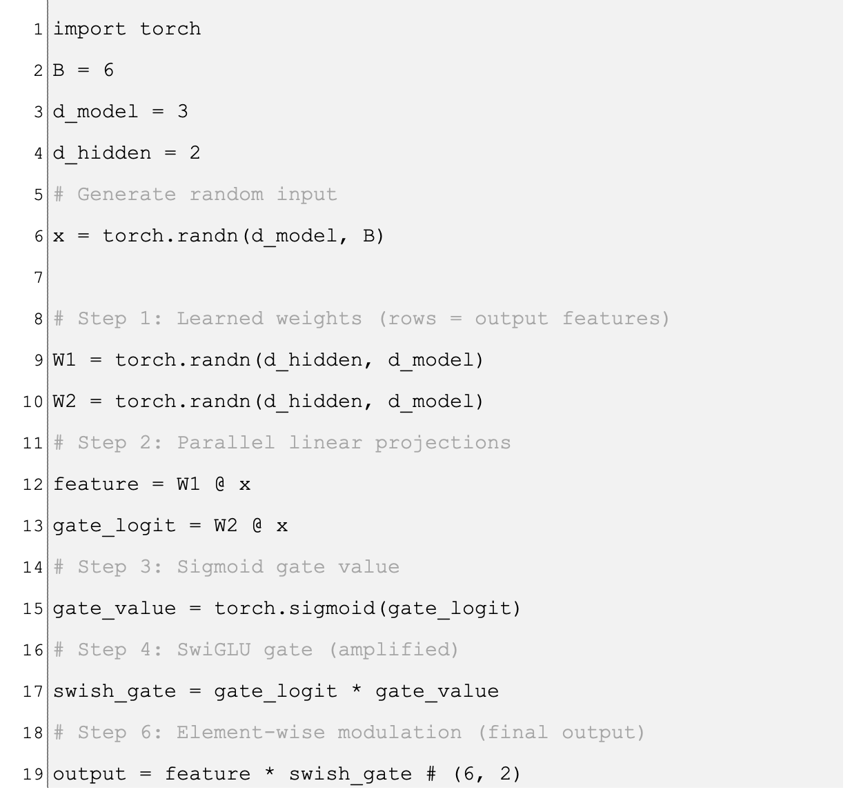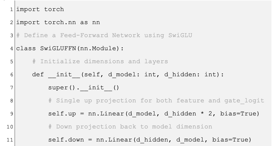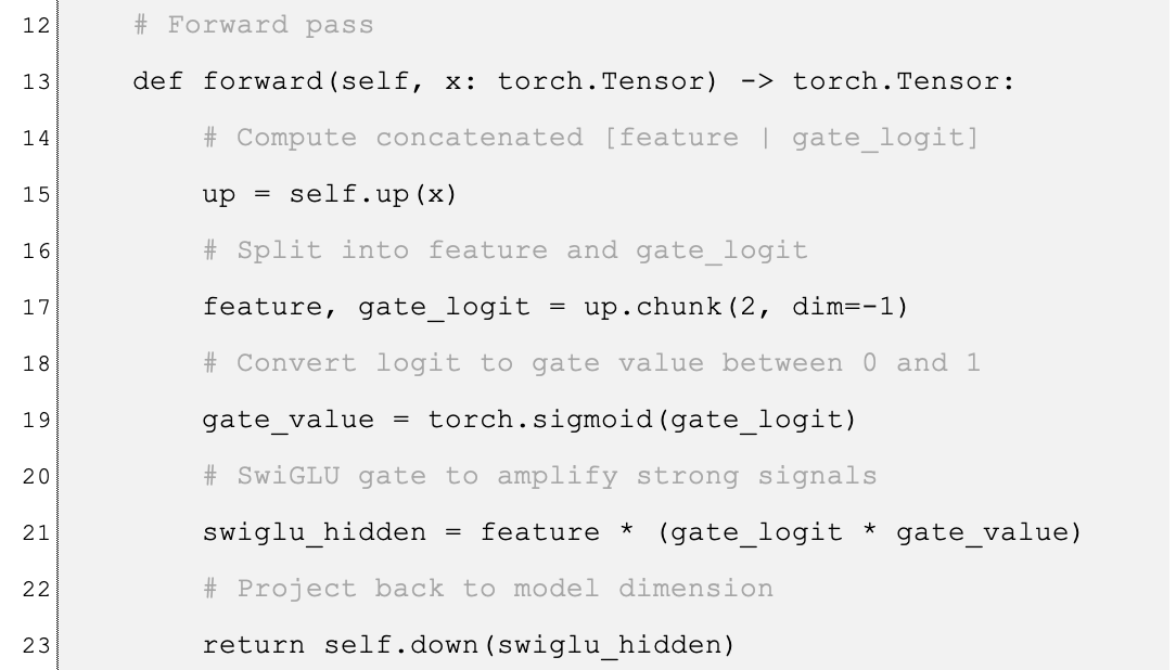 Below is a practical implementation of SwiGLU inside a feed-forward network. Instead of using two separate linear layers for the feature and gate branches, we combine them into a single “up” projection that outputs twice the hidden dimension. his allows the model to perform one larger matrix multiplication instead of two smaller ones. In modern GPU kernels, a single larger matmul is typically more efficient After this combined projection, the tensor is split into feature and gate branches, the gating and amplification are applied, and the result is projected back to the model dimension. This structure reflects how SwiGLU is implemented in most frontier Transformer models for both performance and scalability.