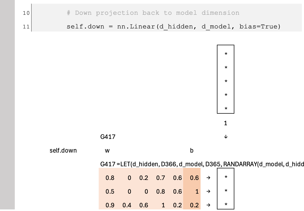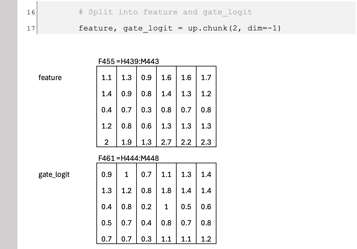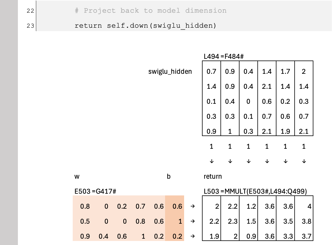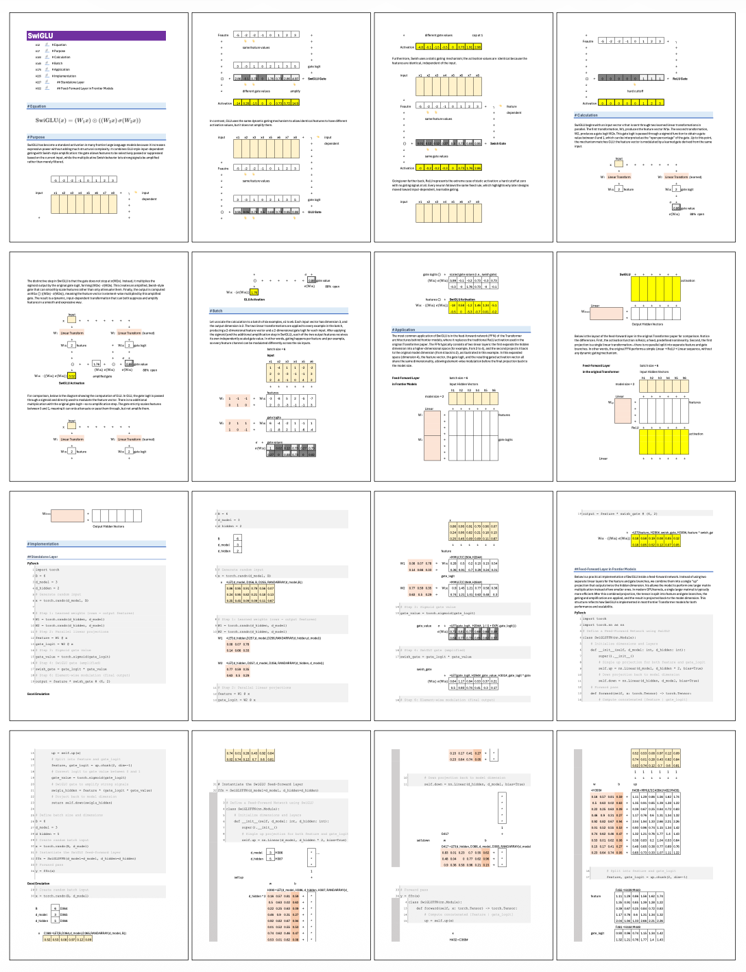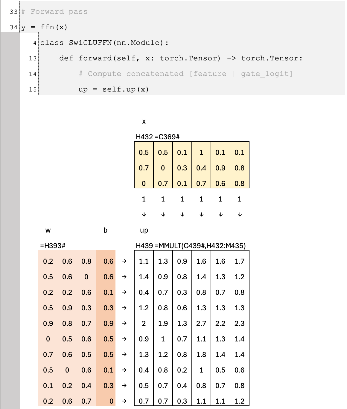 Below is a practical implementation of SwiGLU inside a feed-forward network. Instead of using two separate linear layers for the feature and gate branches, we combine them into a single “up” projection that outputs twice the hidden dimension. his allows the model to perform one larger matrix multiplication instead of two smaller ones. In modern GPU kernels, a single larger matmul is typically more efficient After this combined projection, the tensor is split into feature and gate branches, the gating and amplification are applied, and the result is projected back to the model dimension. This structure reflects how SwiGLU is implemented in most frontier Transformer models for both performance and scalability.