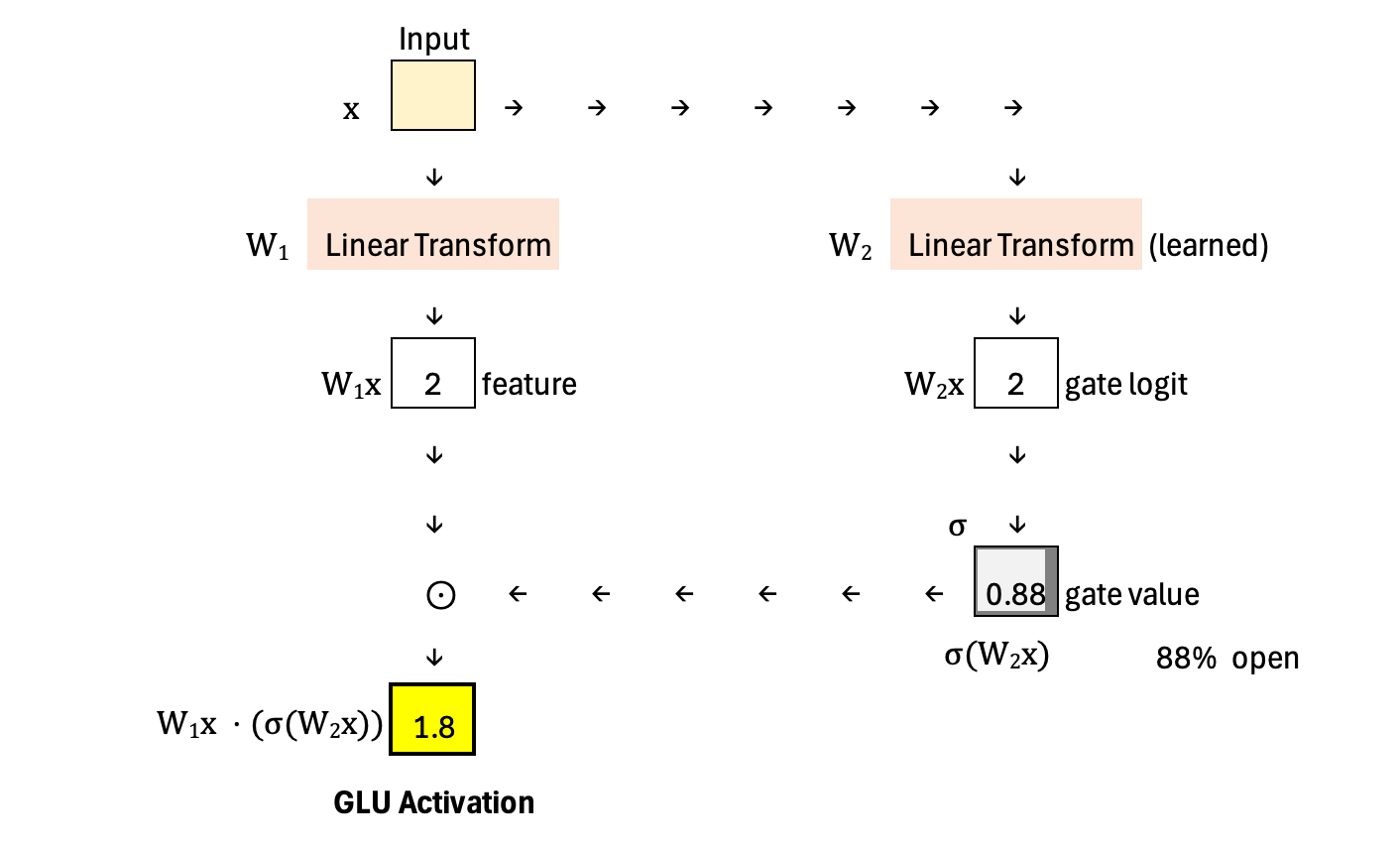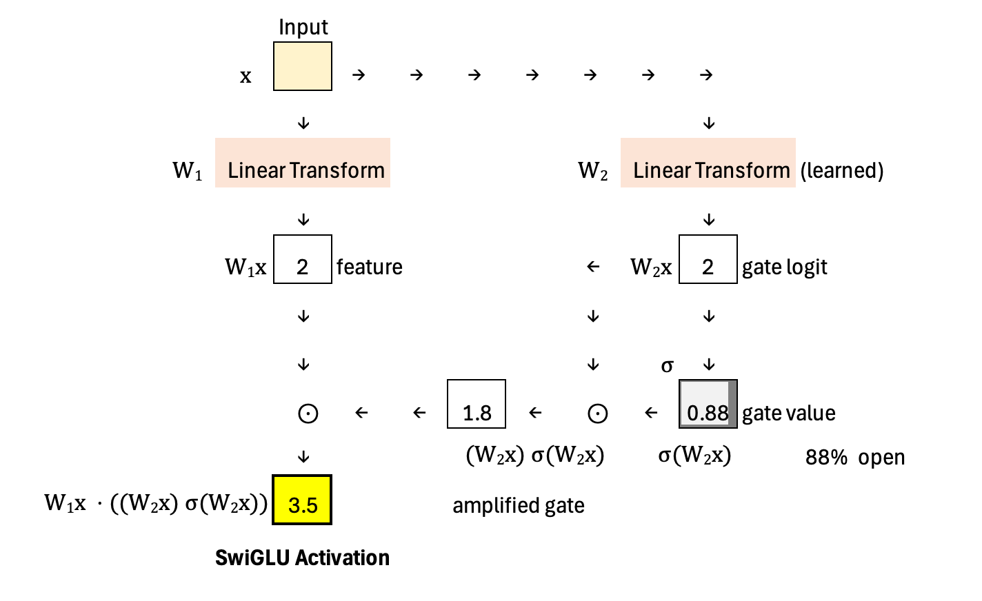 SwiGLU begins with an input vector x that is sent through two learned linear transformations in parallel. The first transformation, W1, produces the feature vector W1x. The second transformation, W2, produces a gate logit W2x. This gate logit is passed through a sigmoid function to obtain a gate value between 0 and 1, which can be interpreted as the “open percentage” of the gate. Up to this point, the mechanism matches GLU: the feature vector is modulated by a learned gate derived from the same input.