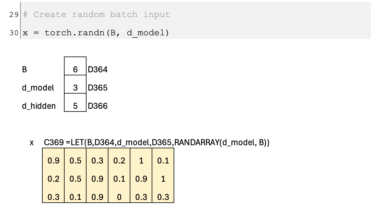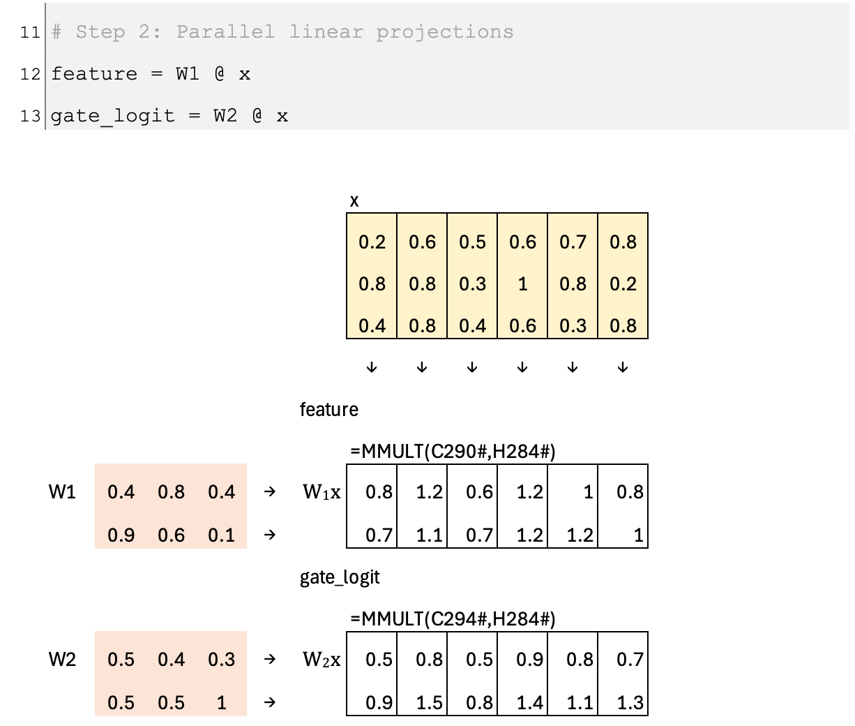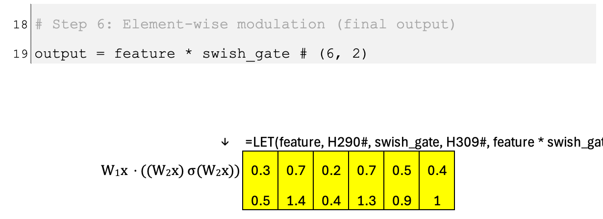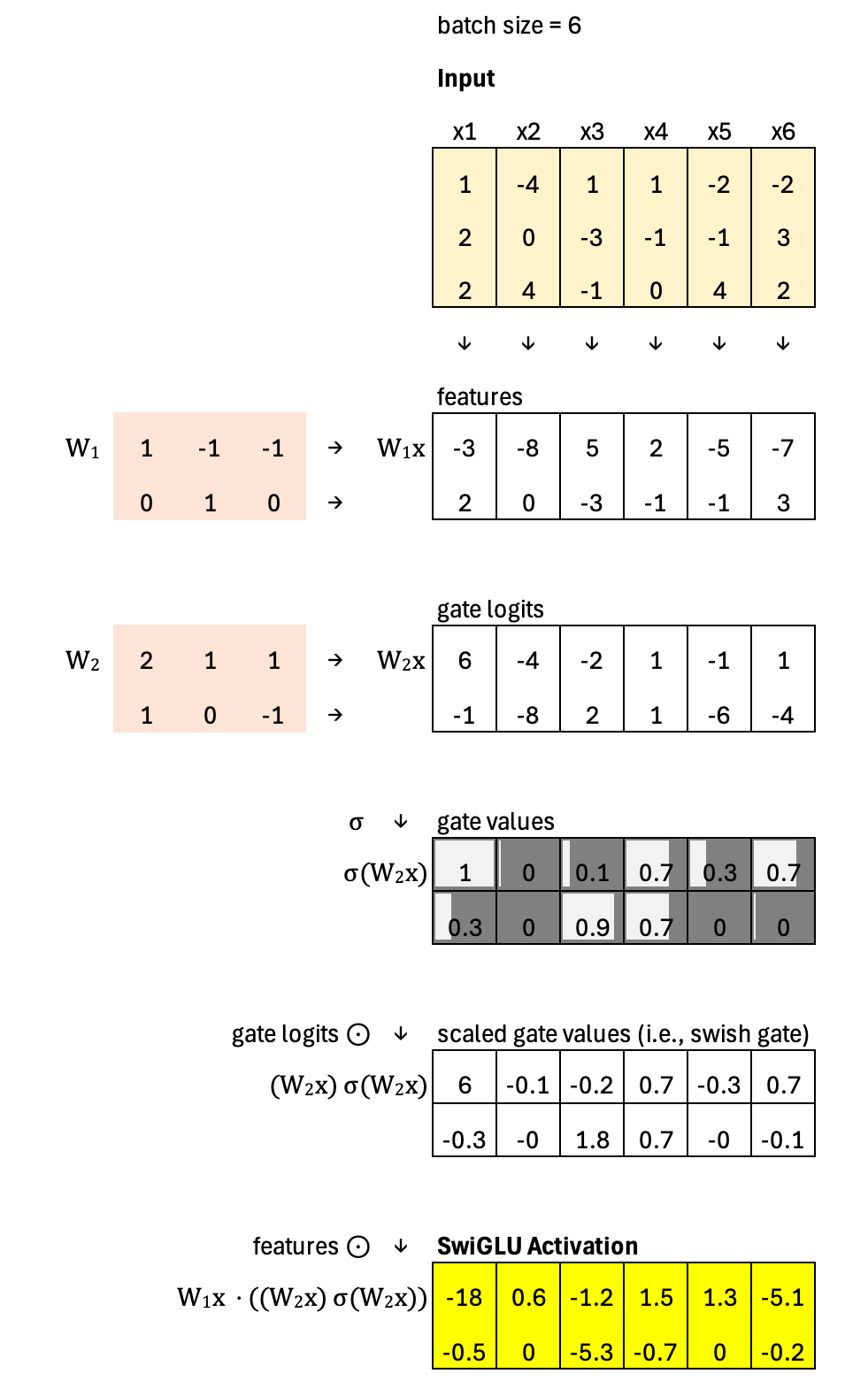 Let us scale the calculation to a batch of six examples, x1 to x6. Each input vector has dimension 3, and the output dimension is 2. The two linear transformations are applied to every example in the batch, producing a 2-dimensional feature vector and a 2-dimensional gate logit for each input. After applying the sigmoid (and the additional amplification step in SwiGLU), each of the two output features receives its own independently scaled gate value. In other words, gating happens per feature and per example, so every feature channel can be modulated differently across the six inputs.