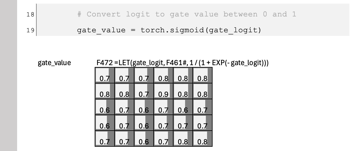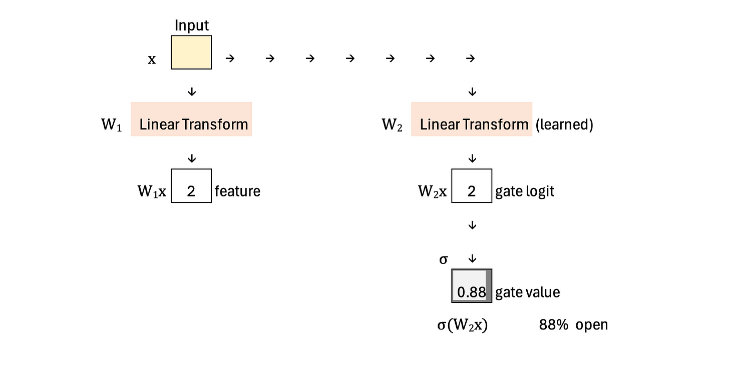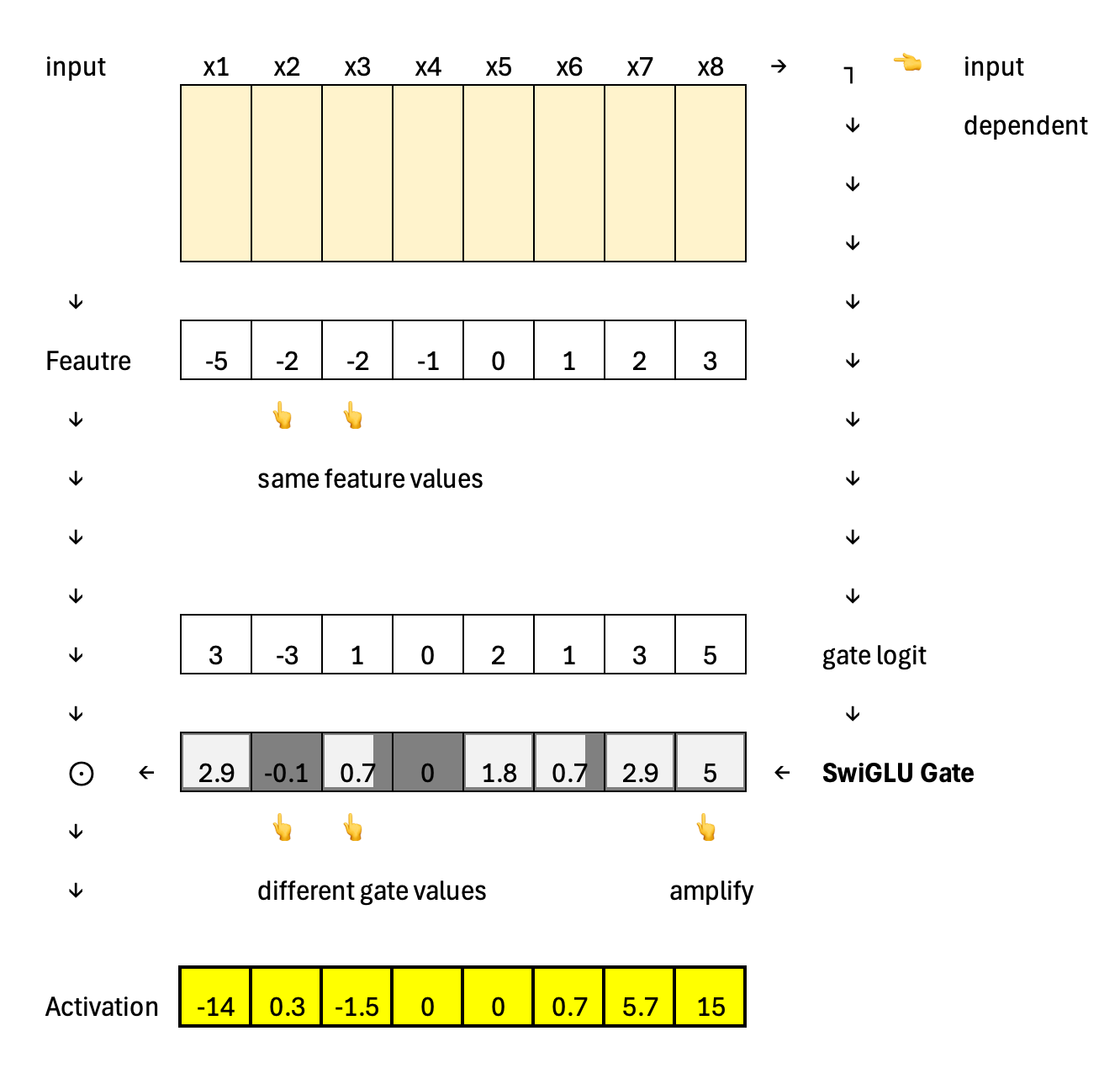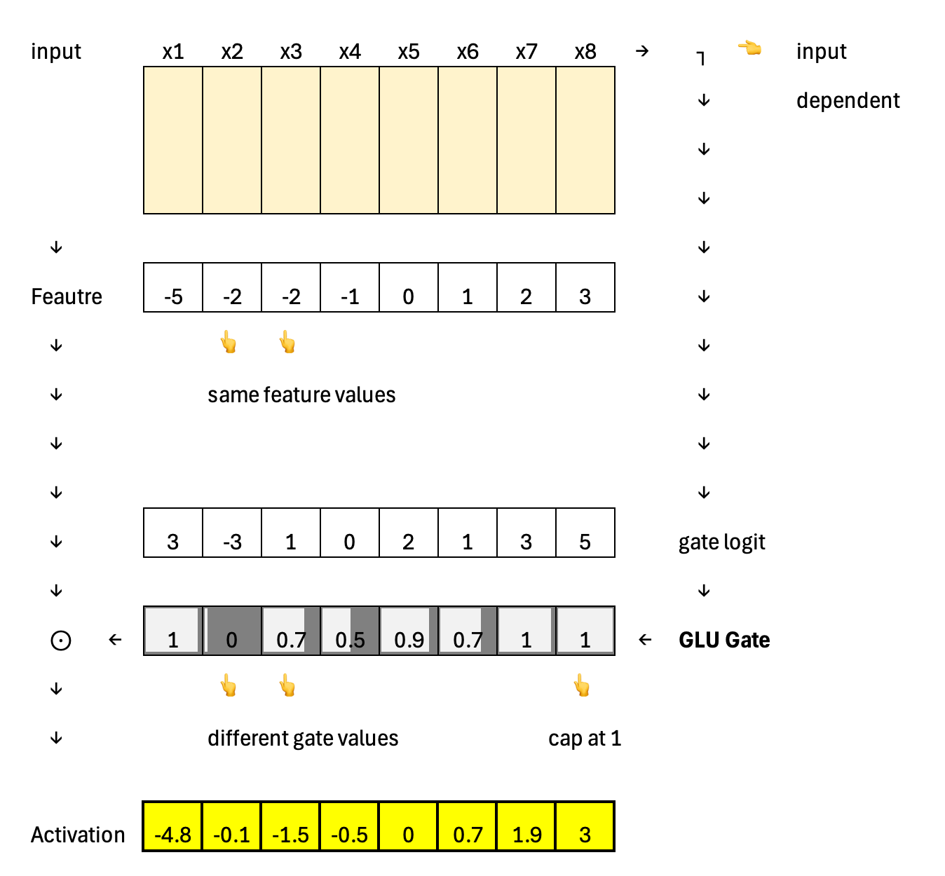 For comparison, below is the diagram showing the computation of GLU. In GLU, the gate logit is passed through a sigmoid and directly used to modulate the feature vector. There is no additional multiplication with the original gate logit—so no amplification step. The gate strictly scales features between 0 and 1, meaning it can only attenuate or pass them through, but not amplify them.