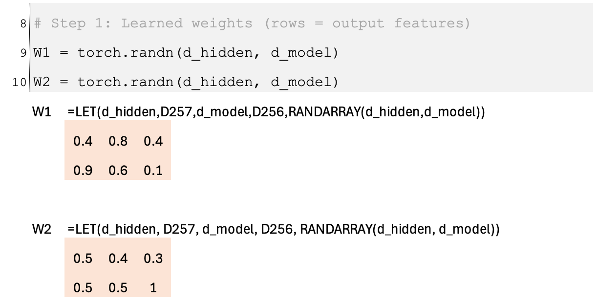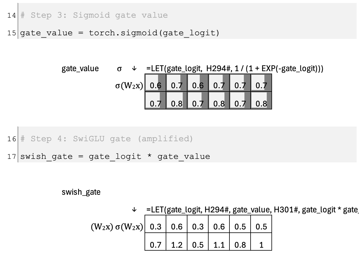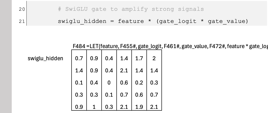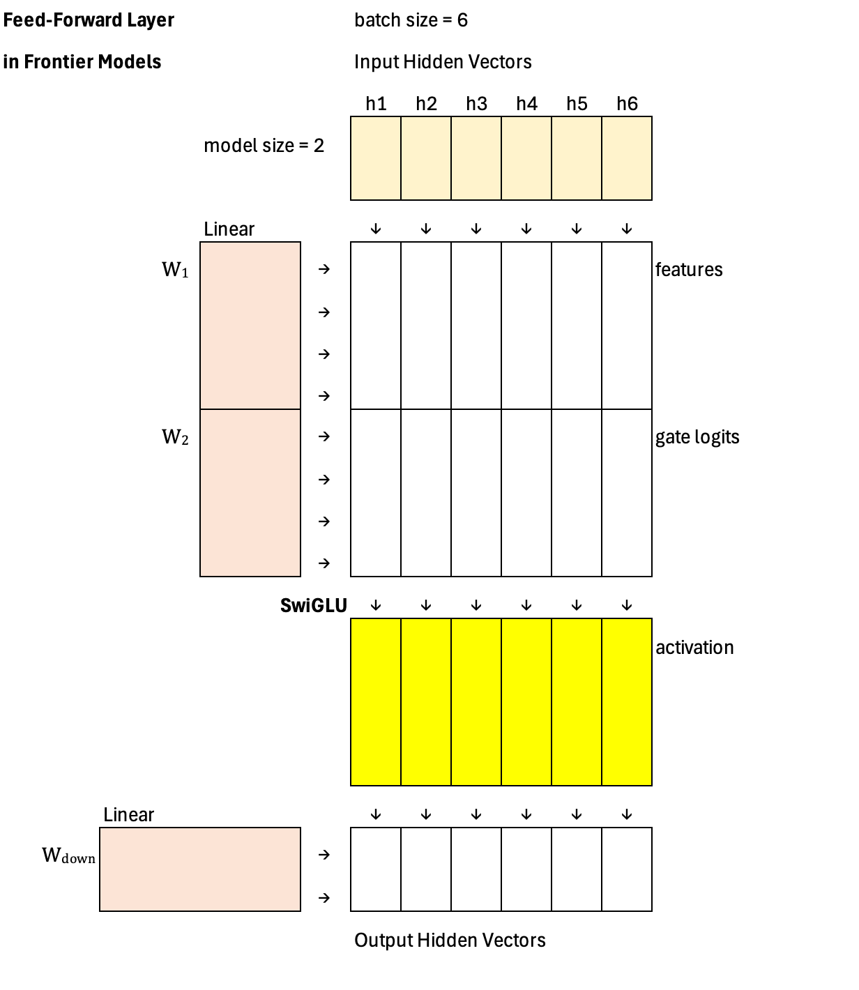 The most common application of SwiGLU is in the feed-forward network (FFN) of the Transformer architectures behind frontier models, where it replaces the traditional ReLU activation used in the original Transformer paper. The FFN typically consists of two linear layers: the first expands the hidden dimension into a higher-dimensional space (for example, from 2 to 4), and the second projects it back to the original model dimension (from 4 back to 2), as illustrated in this example. In this expanded space (dimension 4), the feature vector, the gate logit, and the resulting gated activation vector all share the same dimensionality, allowing element-wise modulation before the final projection back to the model size.