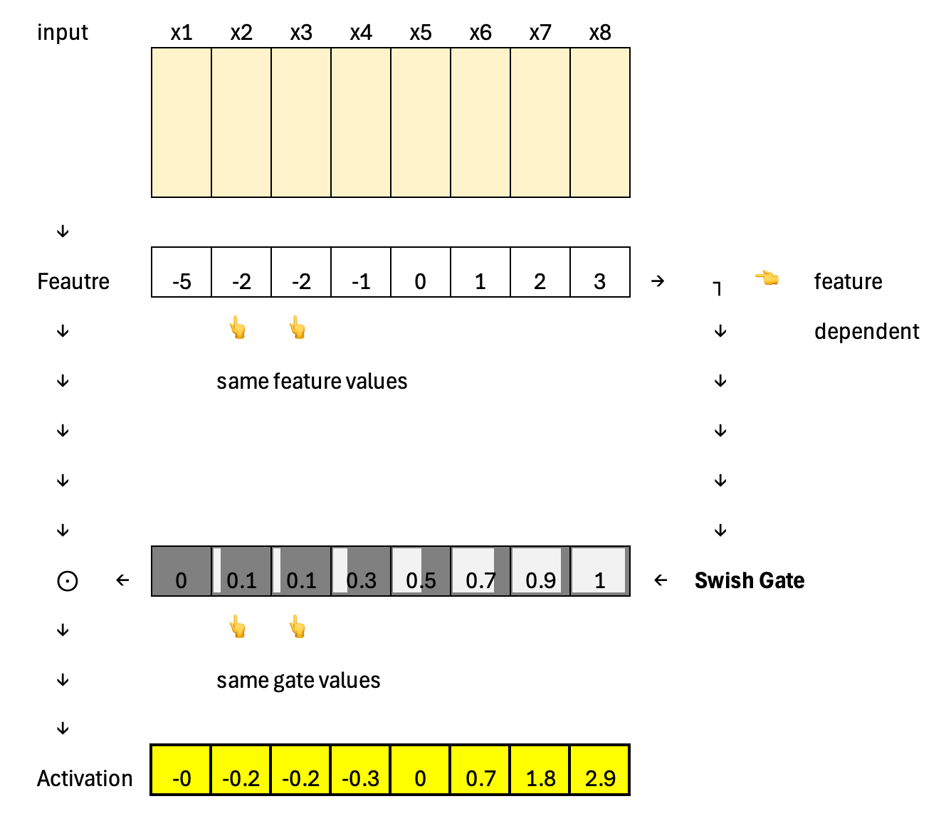 Furthermore, Swish uses a static gating mechanism; the activation values are identical because the features are identical, independent of the input.
