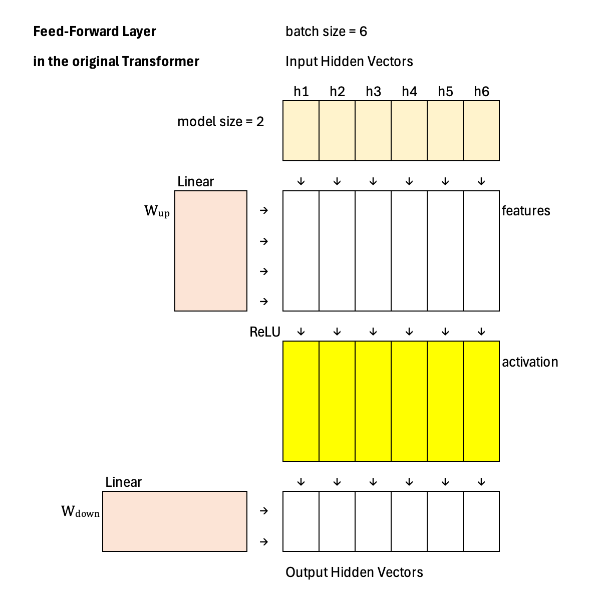 Below is the layout of the feed-forward layer in the original Transformer paper for comparison. Notice the differences. First, the activation function is ReLU, a fixed, predefined nonlinearity. Second, the first projection is a single linear transformation—there is no parallel split into separate feature and gate branches. In other words, the original FFN performs a simple Linear → ReLU → Linear sequence, without any dynamic gating mechanism.