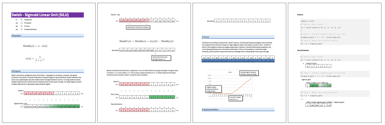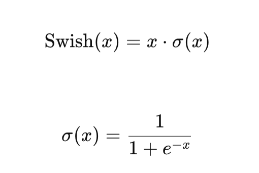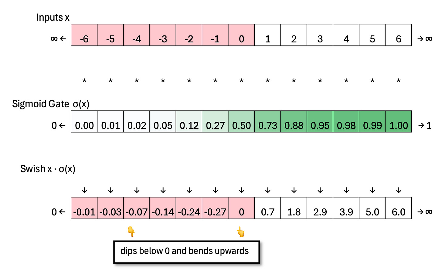 Swish, also known as Sigmoid Linear Unit (SiLU), is designed to introduce a smooth, self-gated activation mechanism. Instead of abruptly cutting off negative inputs like ReLU, Swish multiplies the input x by a sigmoid gate σ(x) that softly scales the signal between 0 and 1. For large positive values, the gate approaches 1 and the function behaves like a linear pass-through. For large negative values, the gate approaches 0, gradually suppressing the signal.