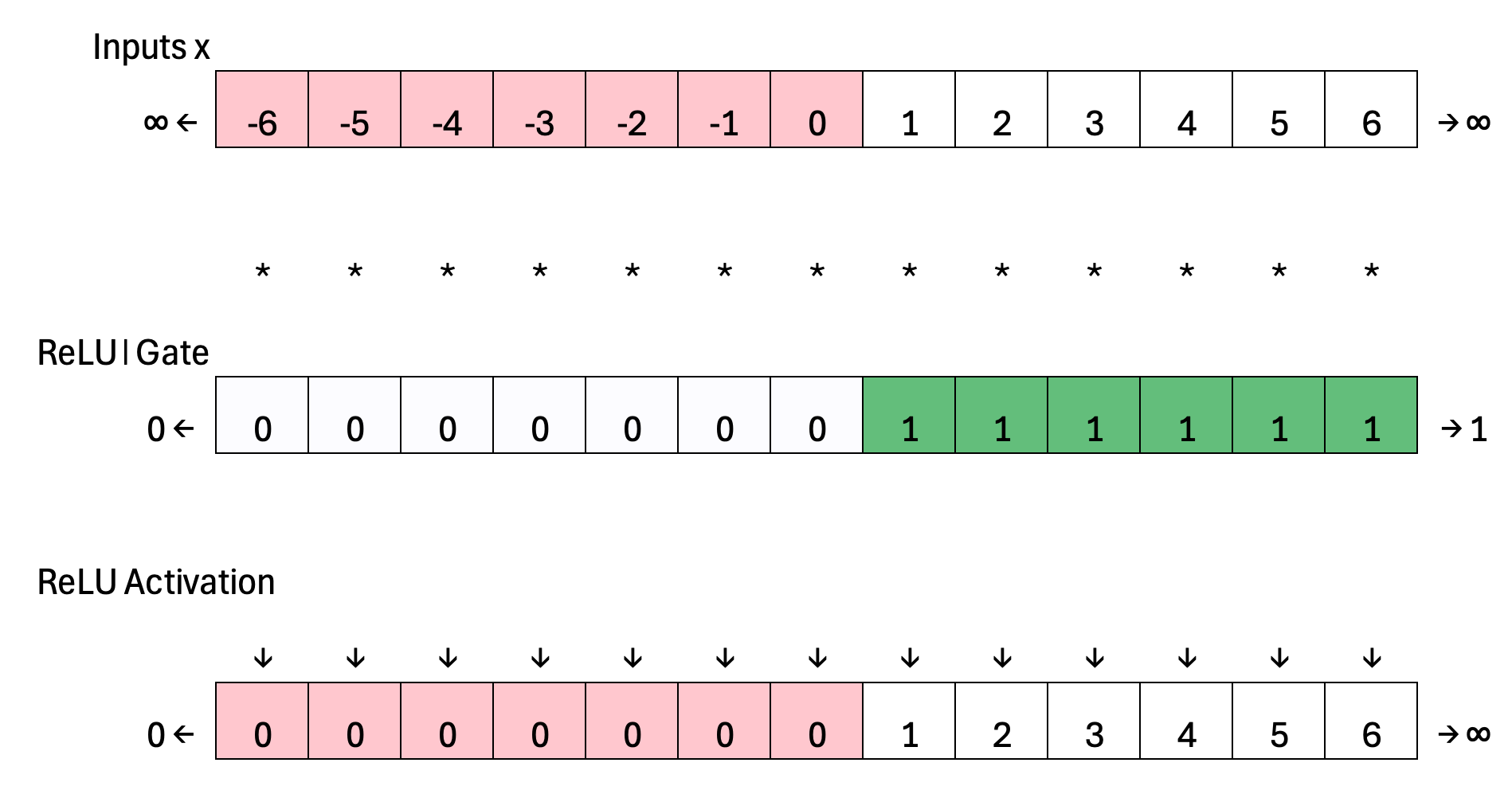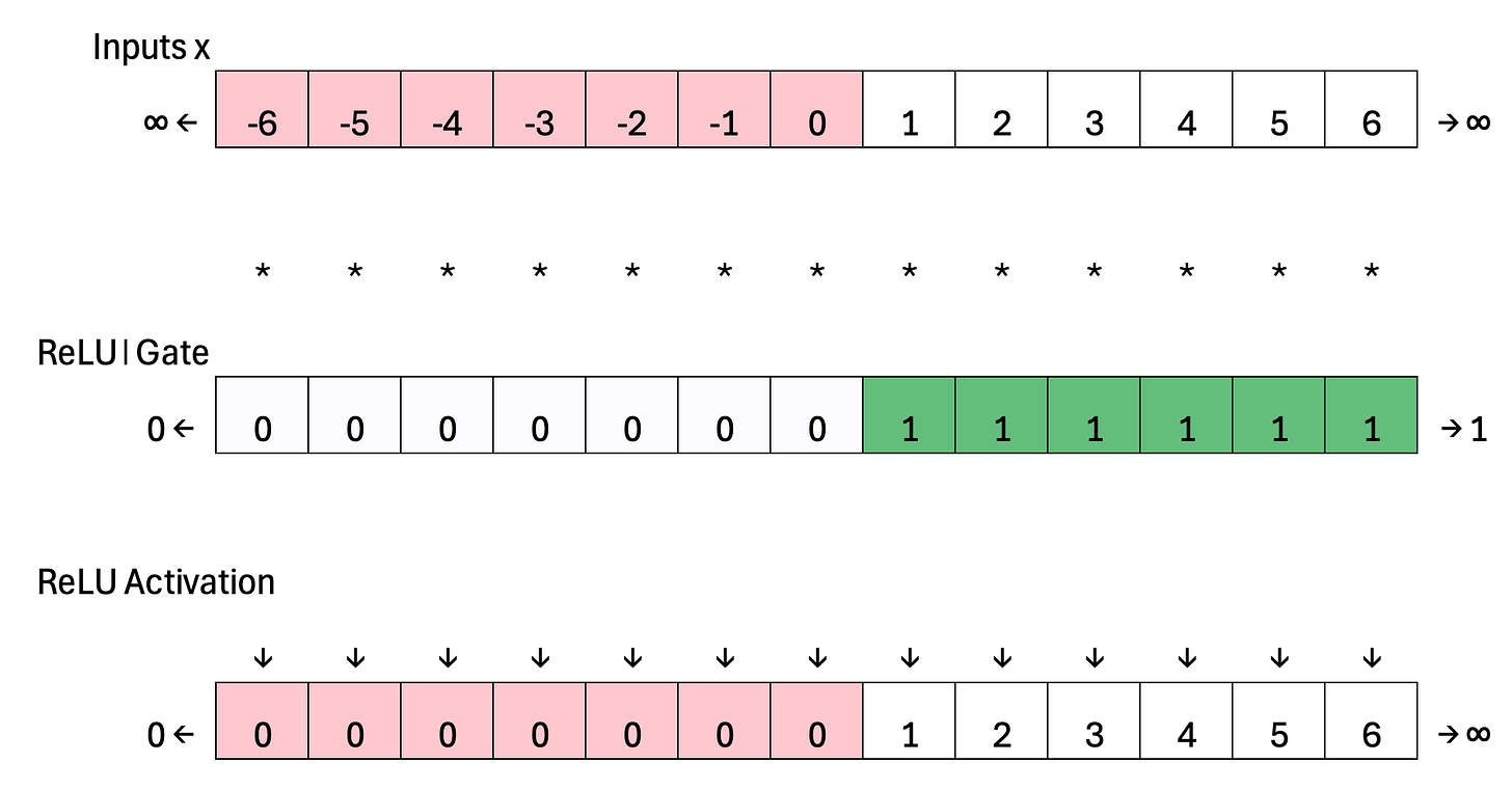 Below is the ReLU activation for comparison. You can think of ReLU as using a hard gate: the gate value is 0 when x <= 0, and 1 when x > 0. This creates a sharp transition at x = 0. Swish replaces this sharp transition with a smooth “swish” transition (pun intended).