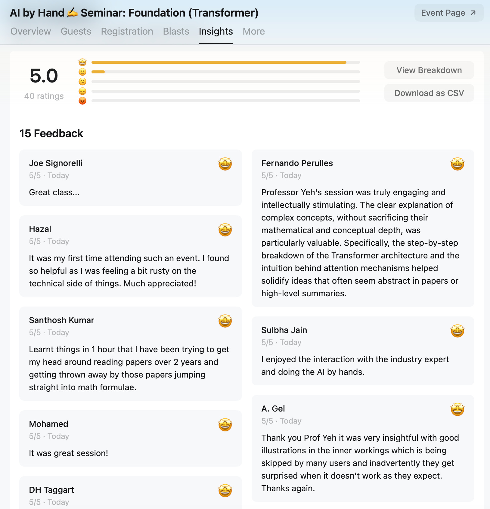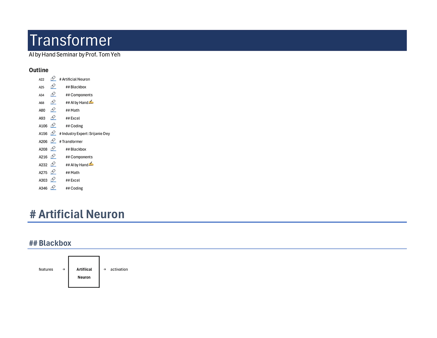 We first practiced on something small and concrete—an artificial neuron—going deeper level by level from (1) black box to (2) components, to (3) tensors, to (4) math, to (5) Excel, and finally to (6) coding. Then we applied the exact same progression to the transformer. My goal was to show the audience how to fish, not just hand them a fish—so they can use this framework to unpack any architecture they encounter next.